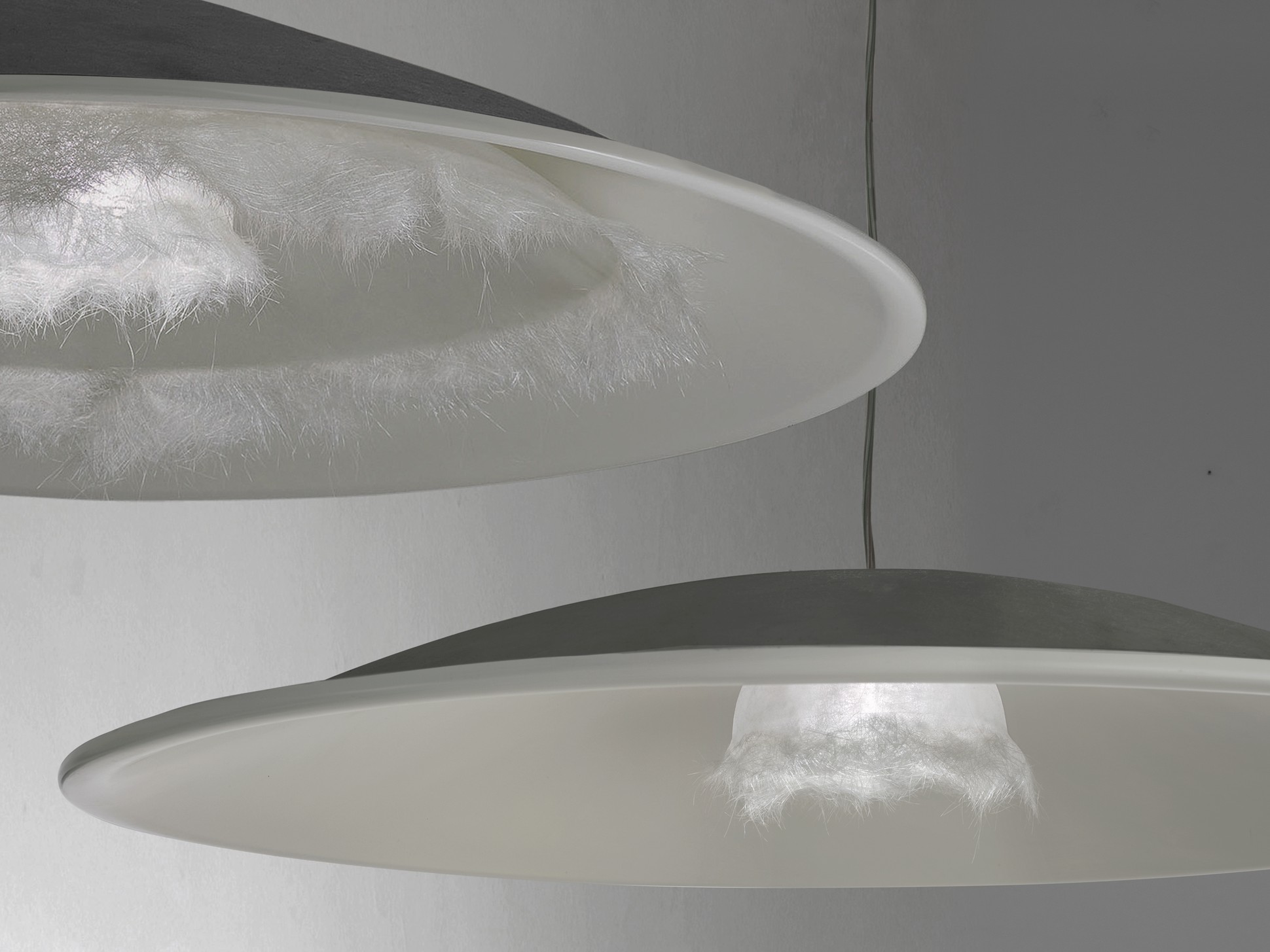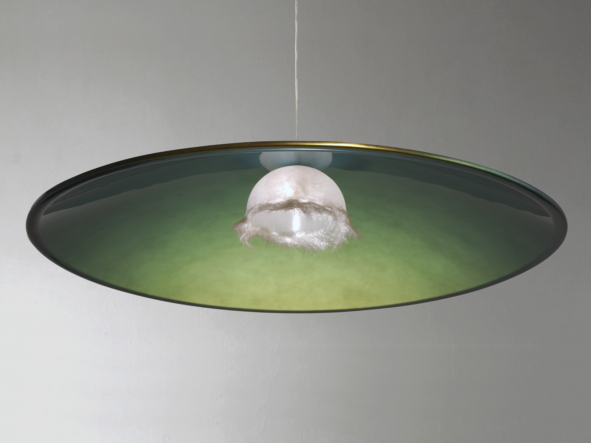 Una lampada a sospensione che nasconde una gemma attorno alla sorgente della sua luce. Un fiore di vetroresina lavorata finemente, che sembra in procinto di sbocciare, regalando a questa creazione contemporanea un tocco di inaspettata poesia.