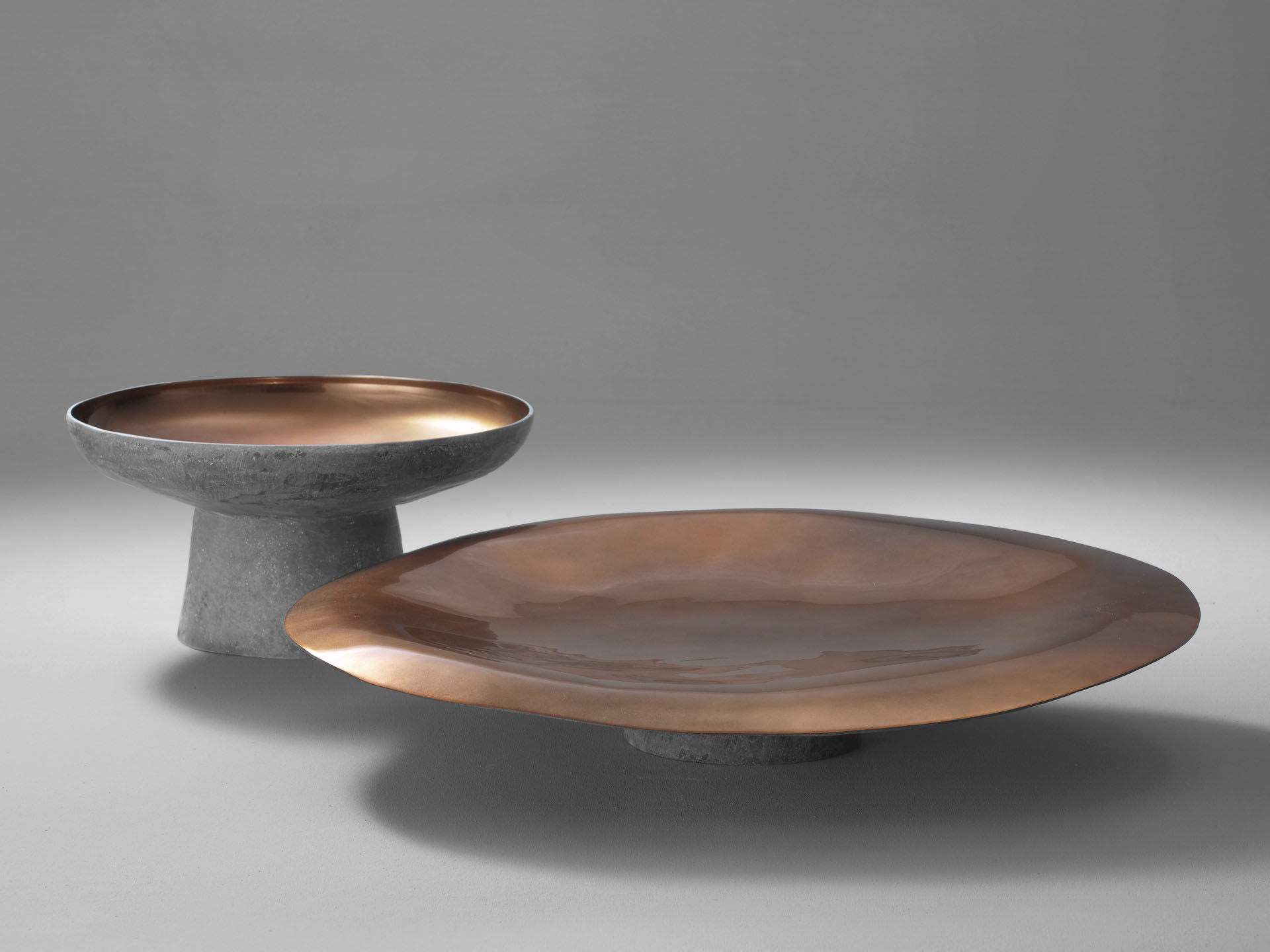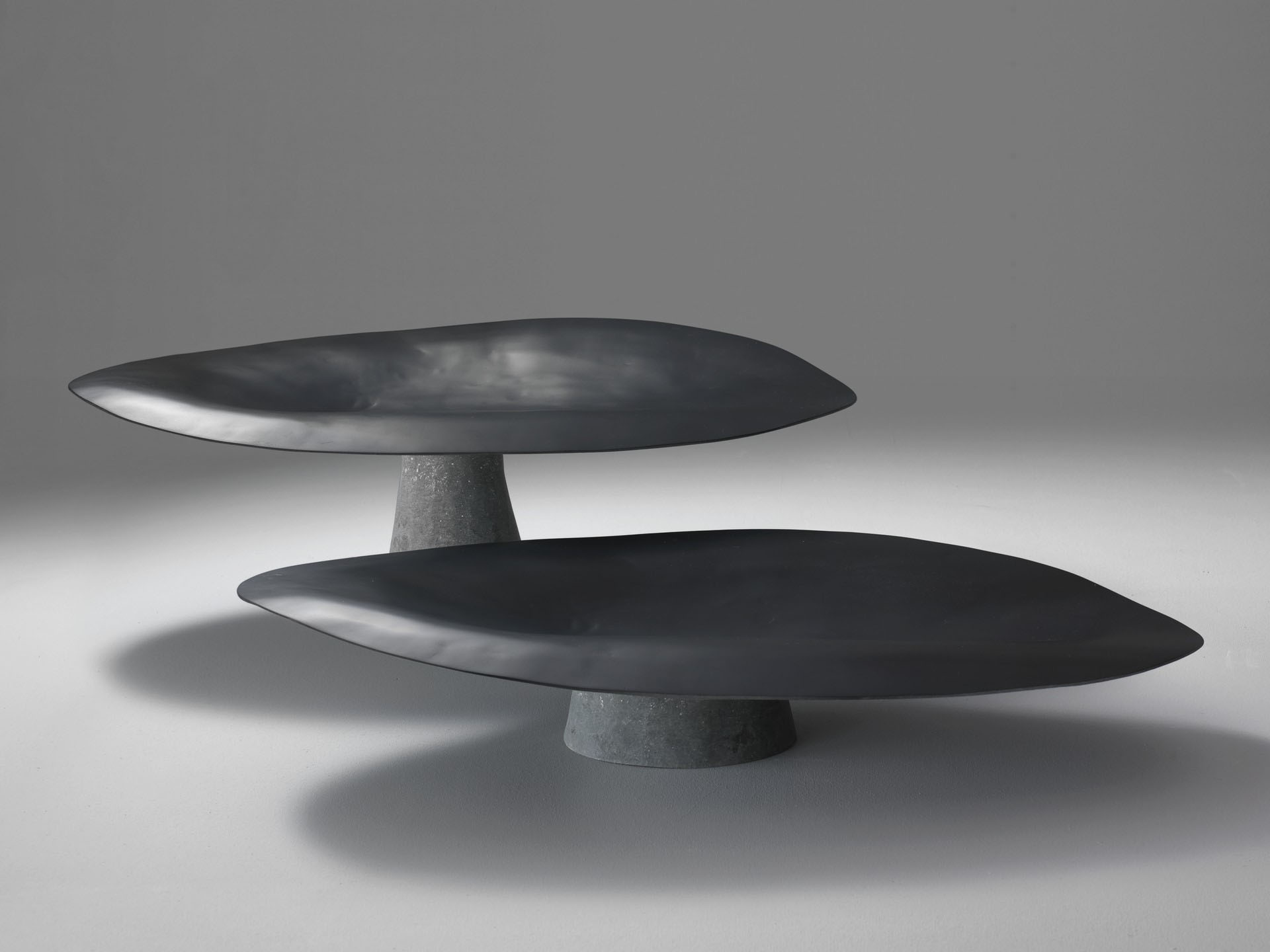 Alzate in vetroresina che colpiscono lo sguardo, glorificando l’oggetto che sorreggono o regalando, da sole, un nuovo movimento alla superficie su cui poggiano.
