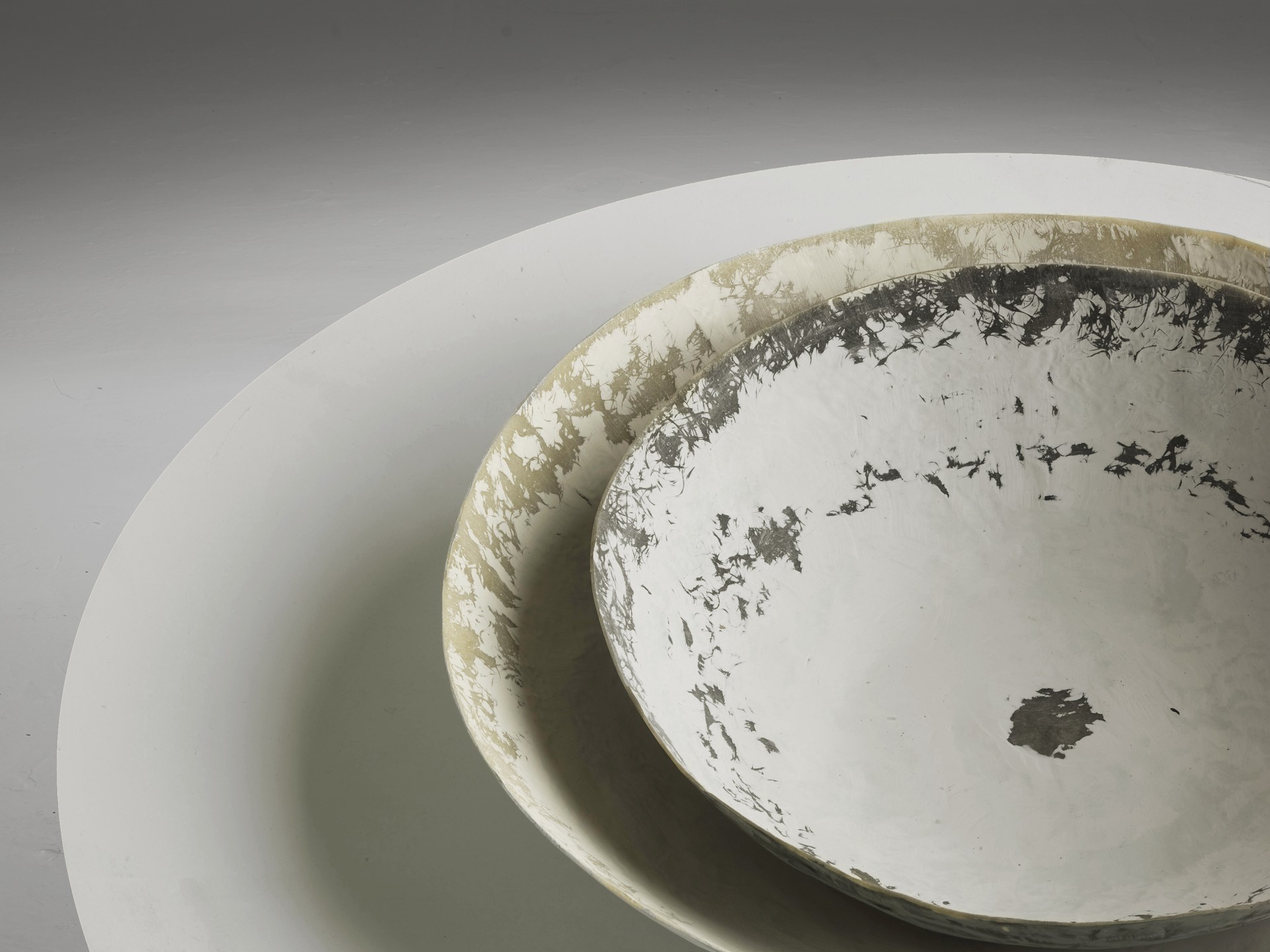 Ciotole dal disegno delicato e dalla forma di studiata imperfezione. Una lavorazione attenta e raffinata della vetroresina regala a queste creazioni i segni di un tempo immaginario.