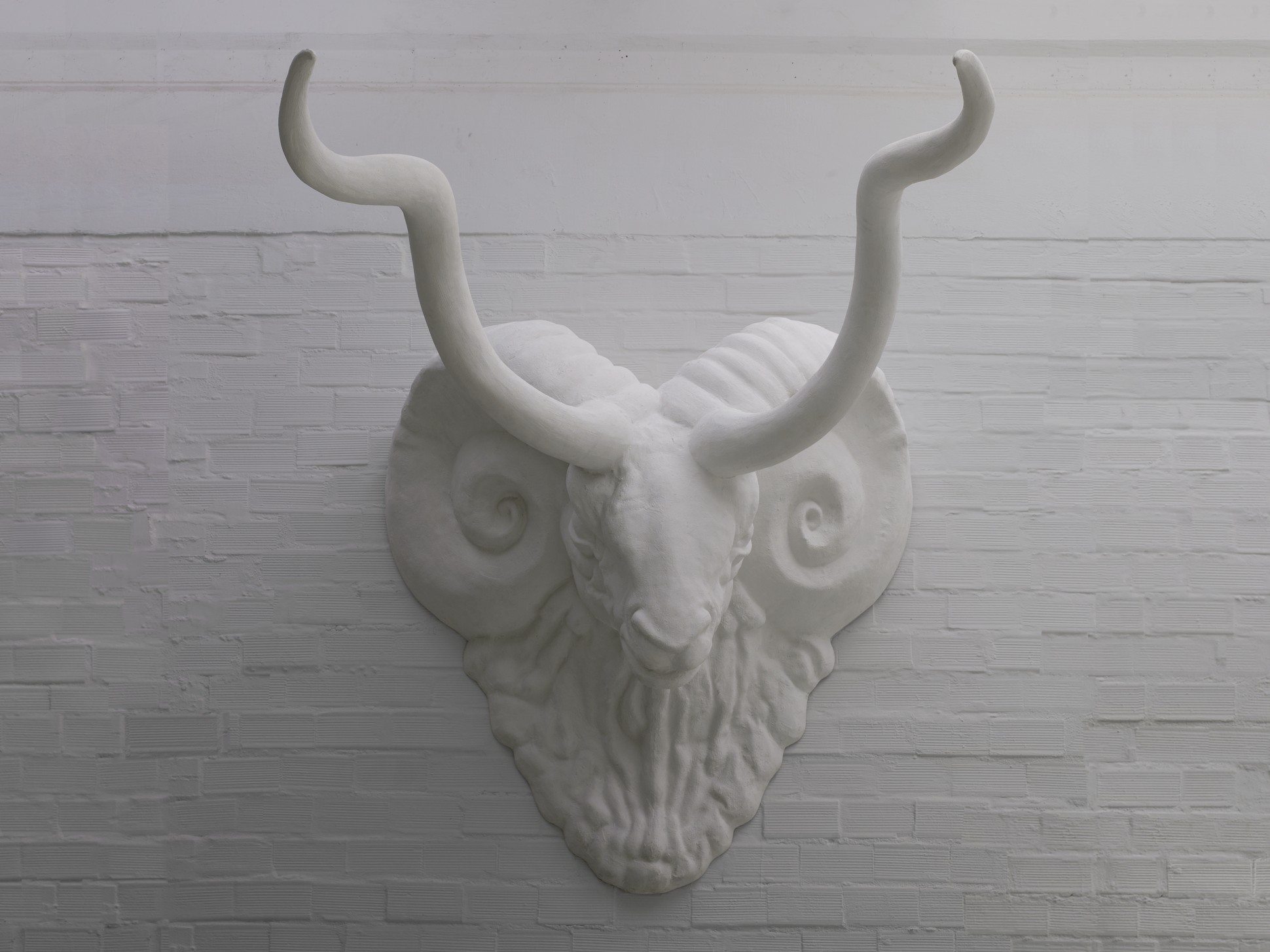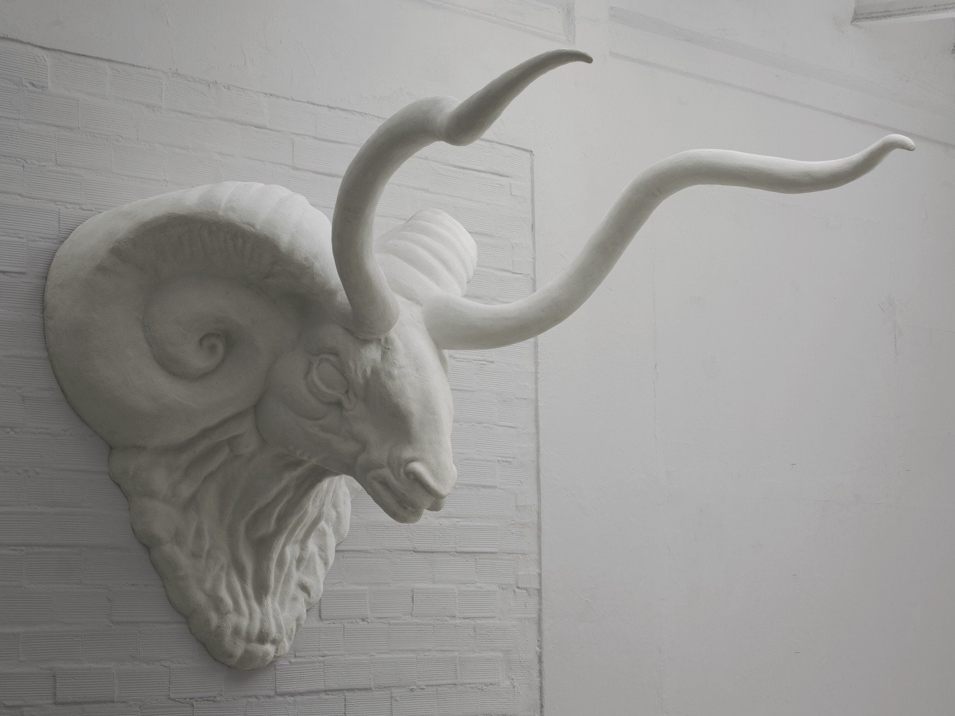 Un ariete, simbolo di genesi e rinascita, sembra contemplare la stanza dalla sua posizione privilegiata, attirando a sé tutti gli sguardi. Un elemento scultoreo dalla dimensione decisamente imponente e dalla potente espressività, che risveglia la parete, comunicando forza e personalità allo spazio circostante.