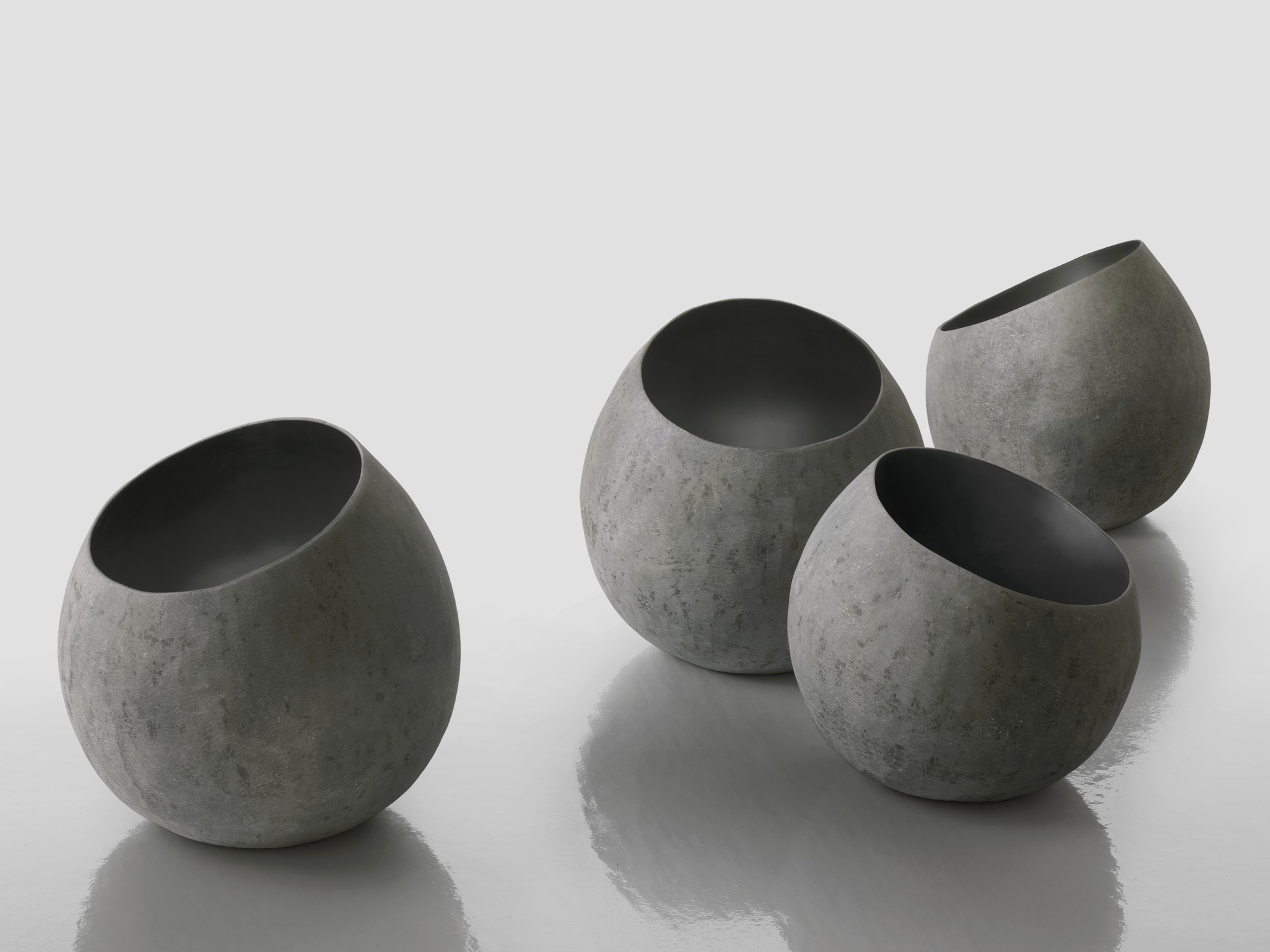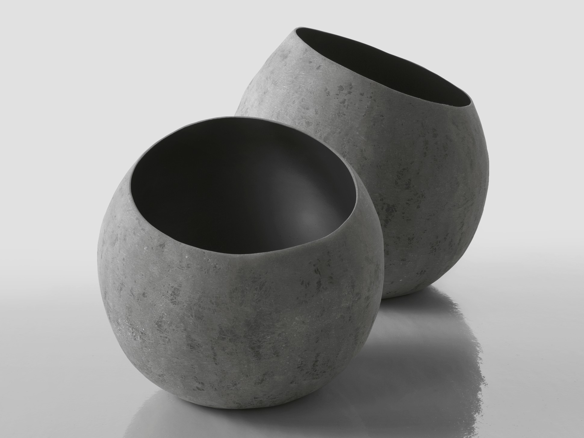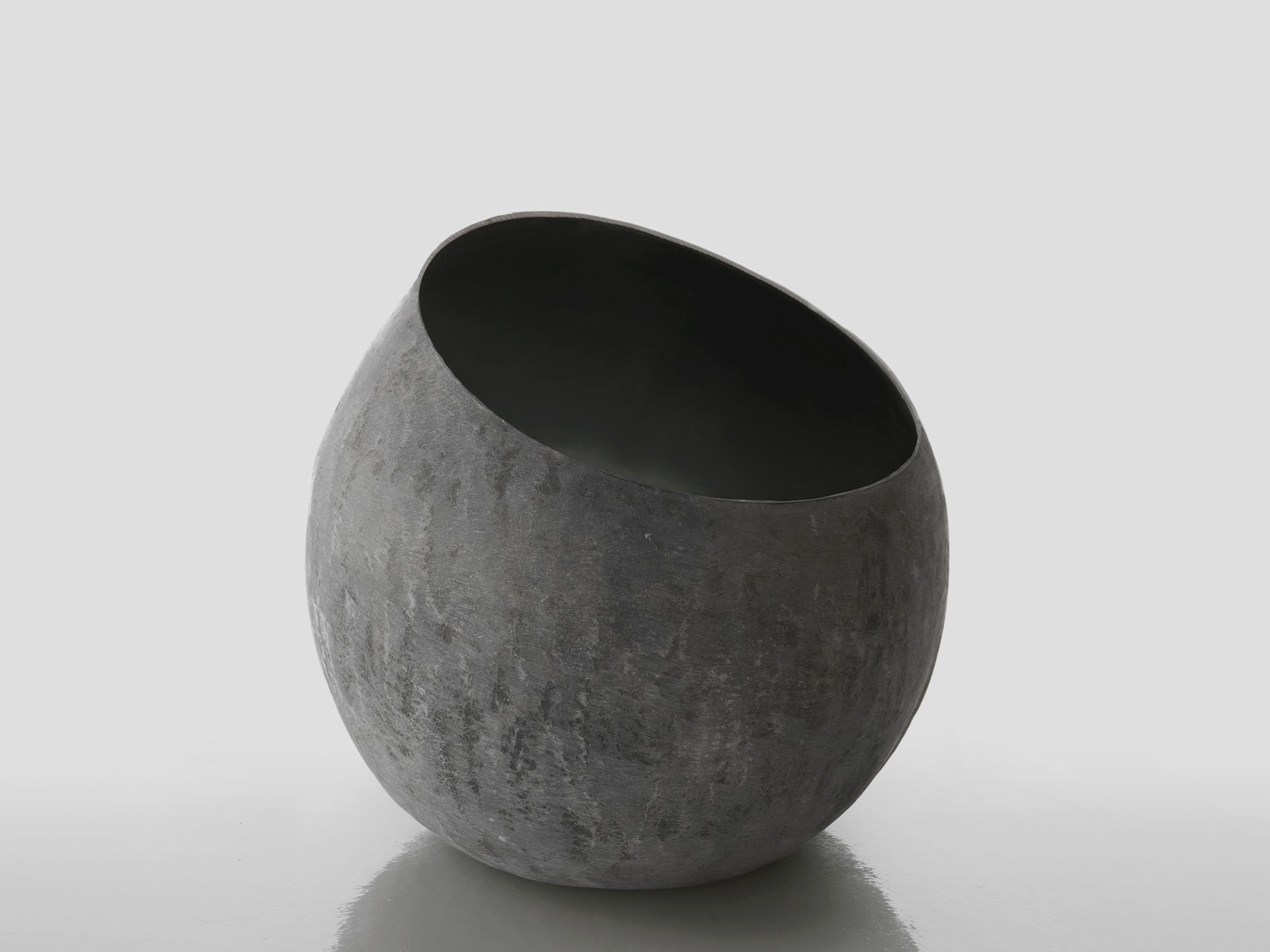 La superficie sferica e leggera in vetroresina rivela un’inaspettata sezione obliqua. Una insolita inclinatura, che rende iconico questo elegante vaso/contenitore, dal design tanto pulito quanto sofisticato.