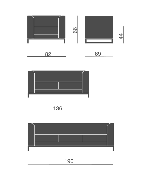 Armchair, 2-seater sofa and 3-seater sofa for reception and waiting areas.