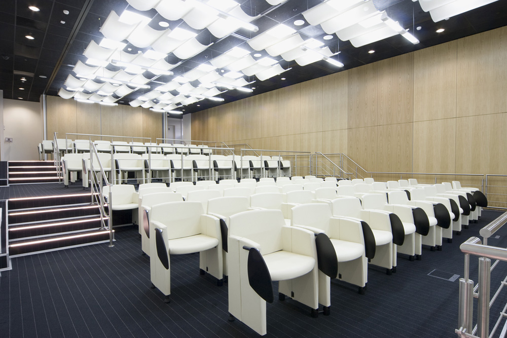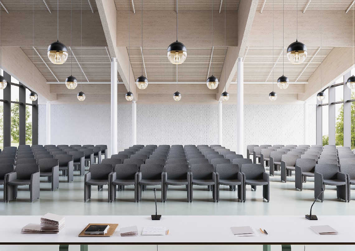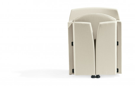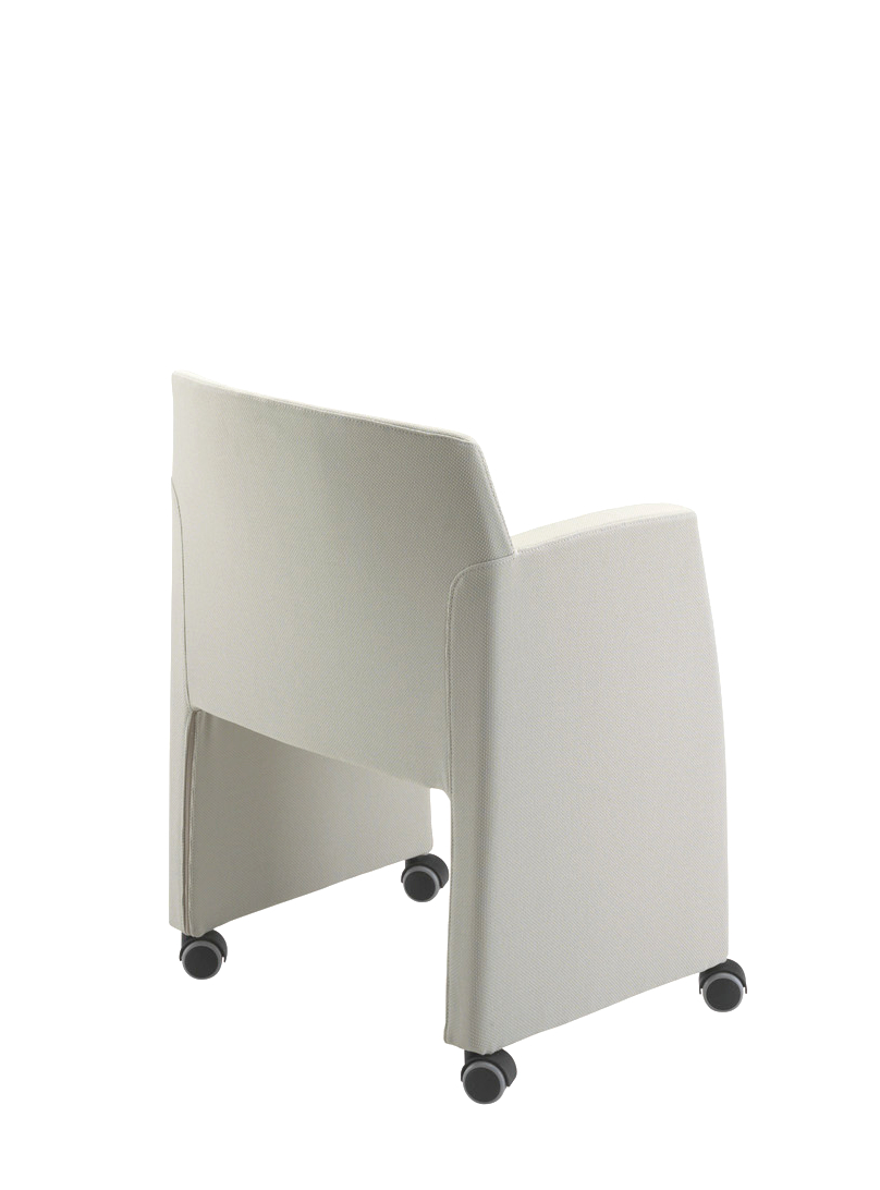 Polyfunctional armchair with fixed or pliable side arms suitable for meeting and conference rooms.