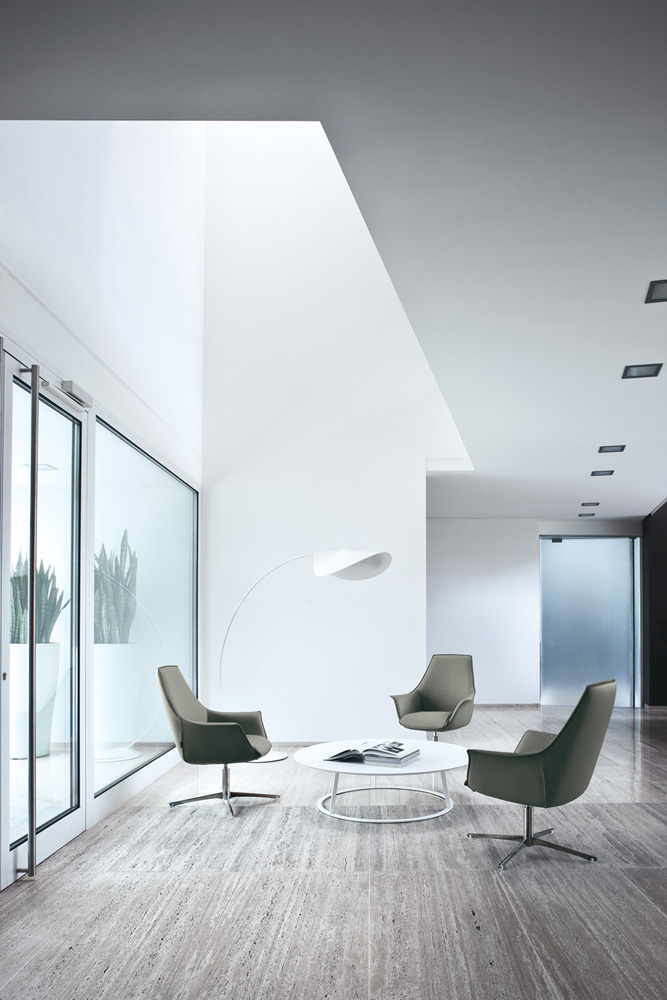 Armchair for relaxing, waiting and reception areas, with different options of either fixed or swivel bases.