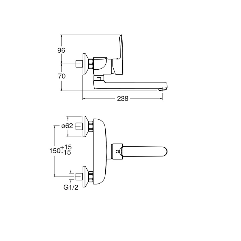 Miscelatore monocomando cucina, bocca orientabile, a parete, con miscelazione meccanica frontale, leva piatta. Punto di erogazione 238 mm