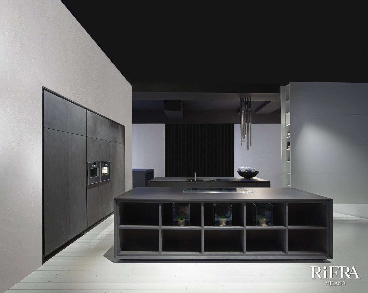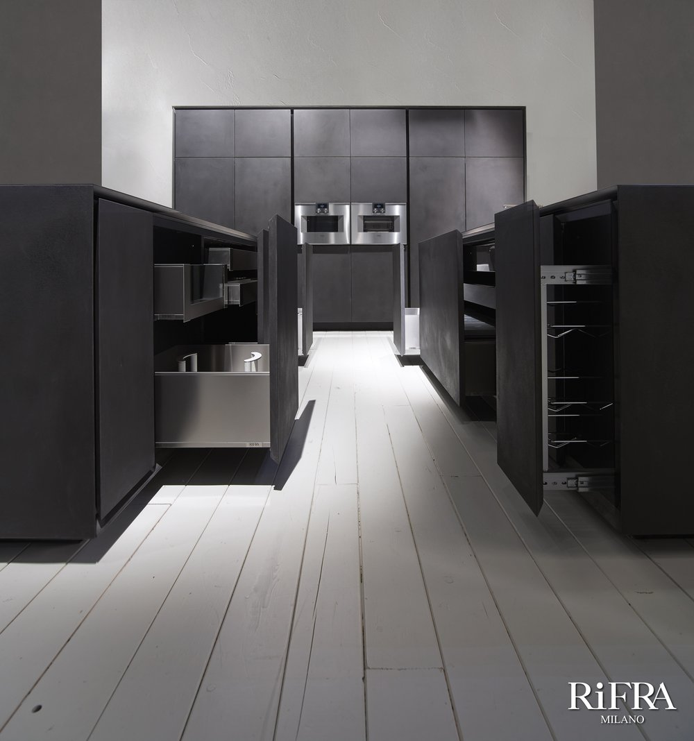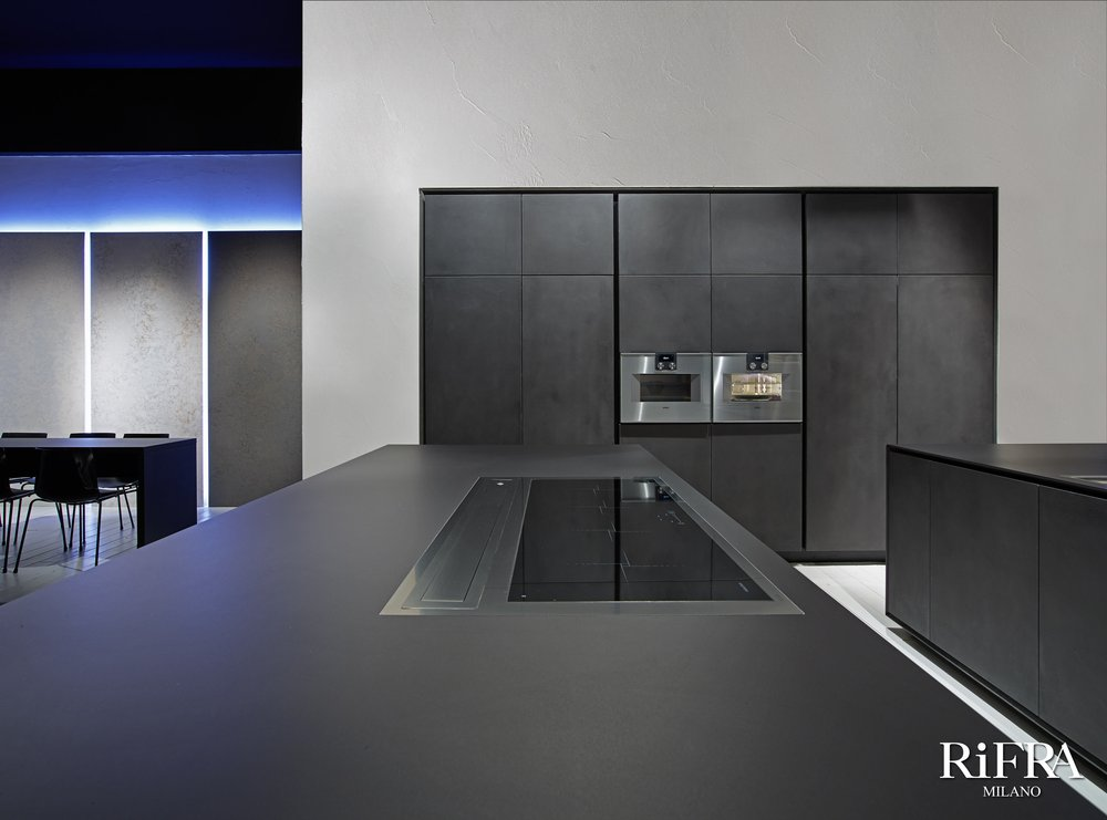 Finitura mobili isola e quinte: cemento nero spatolato a mano.