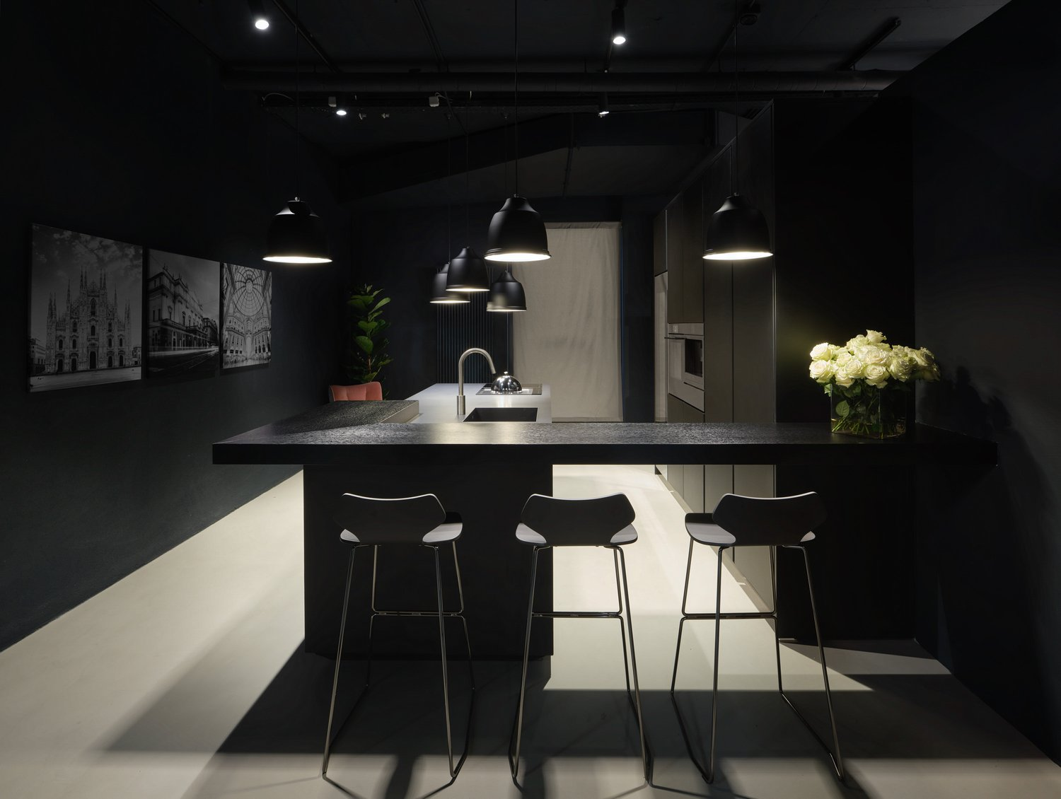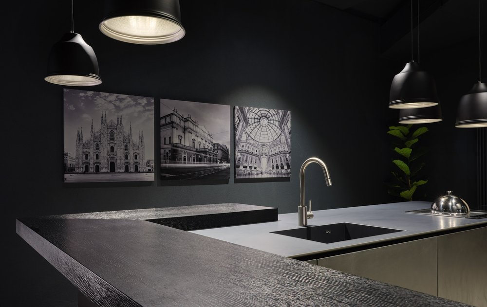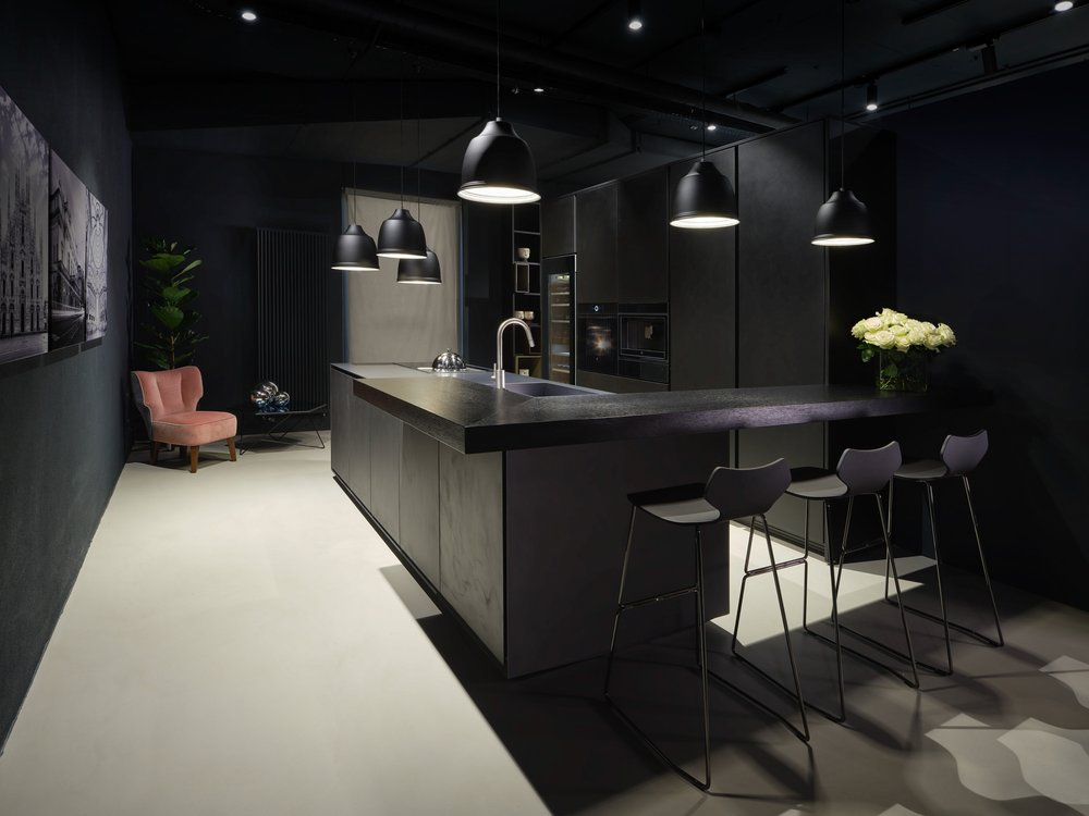 Finitura mobili isola e quinte: cemento nero spatolato a mano.