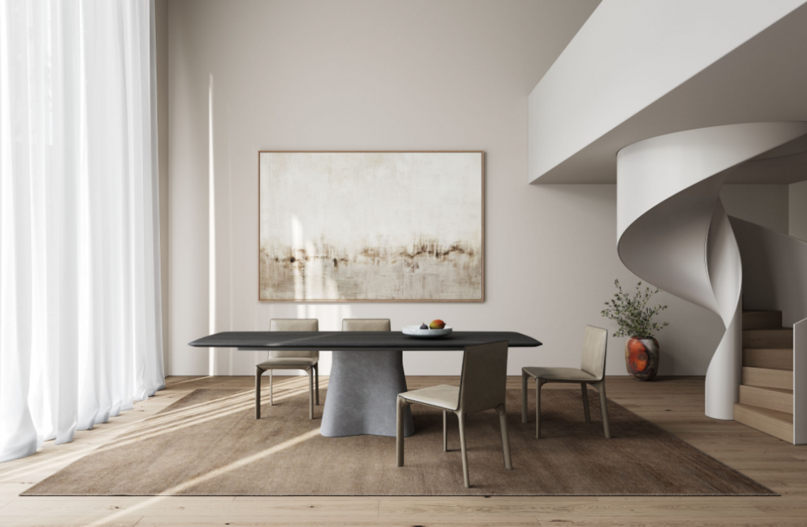 Sculptural strength: Temno Table is a fusion of architecture and sculpture. A table inspired by classical and modern sculpture, made of sensual, natural materials. For an interior design that puts the table center stage.