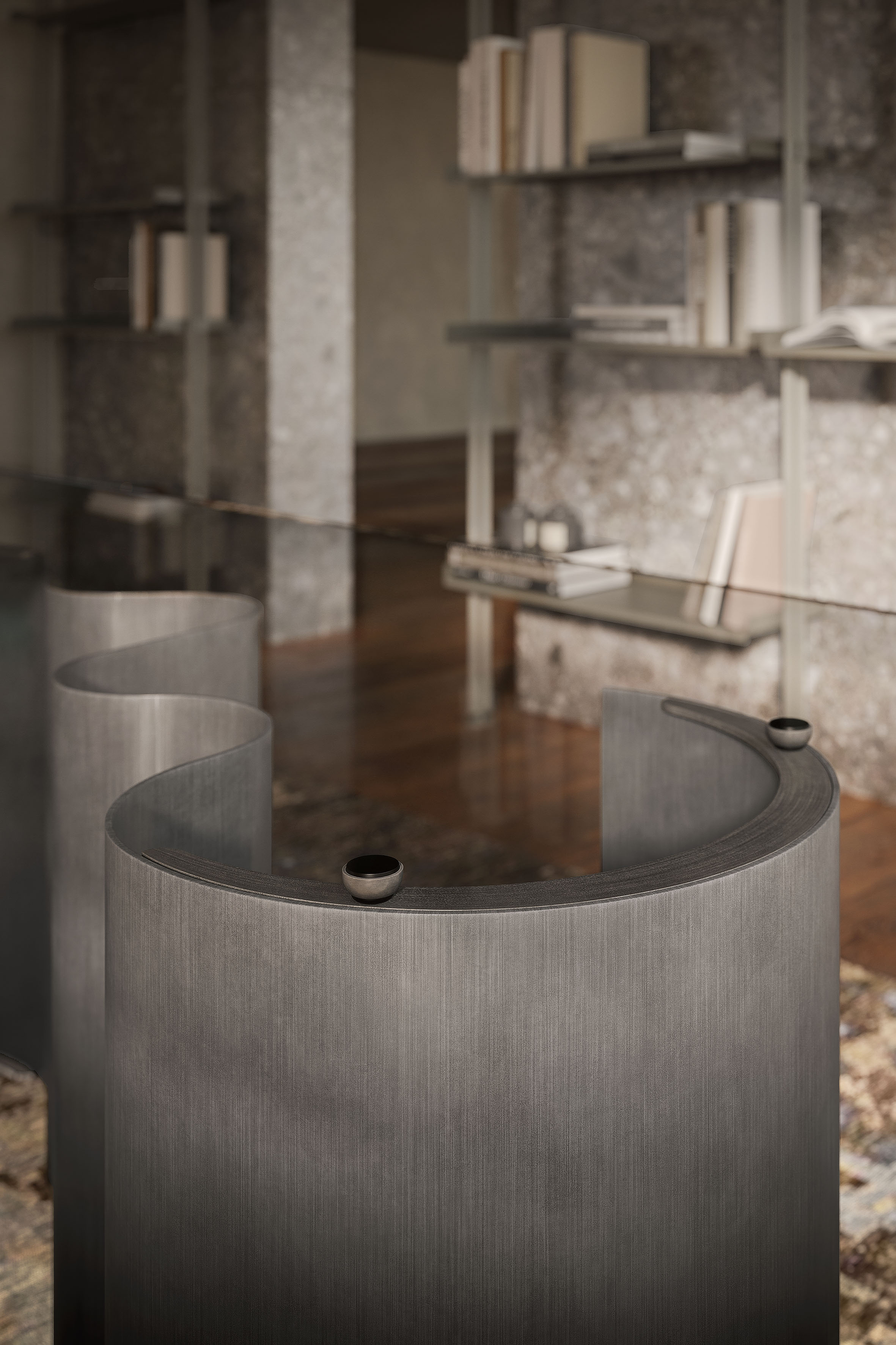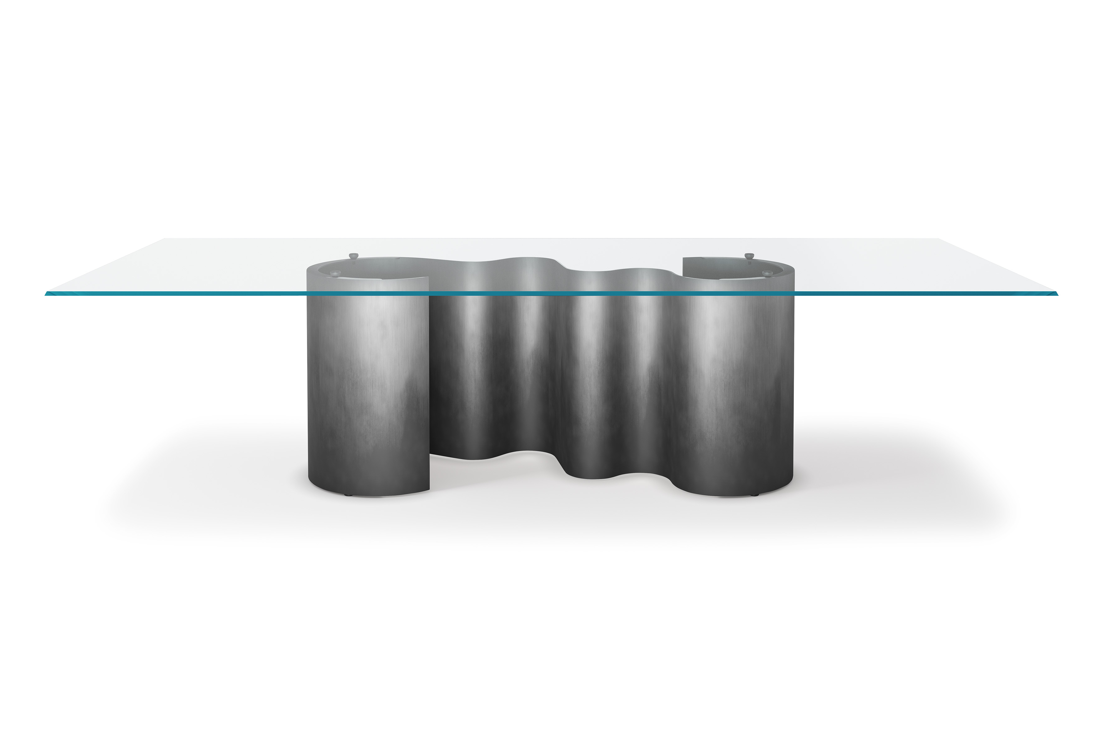 Its sinuous base has been cleverly designed to change in appearance depending on the position from which it is viewed. Full and empty cylinders swap places with the changing light and shadow when viewing this designer table from different angles.