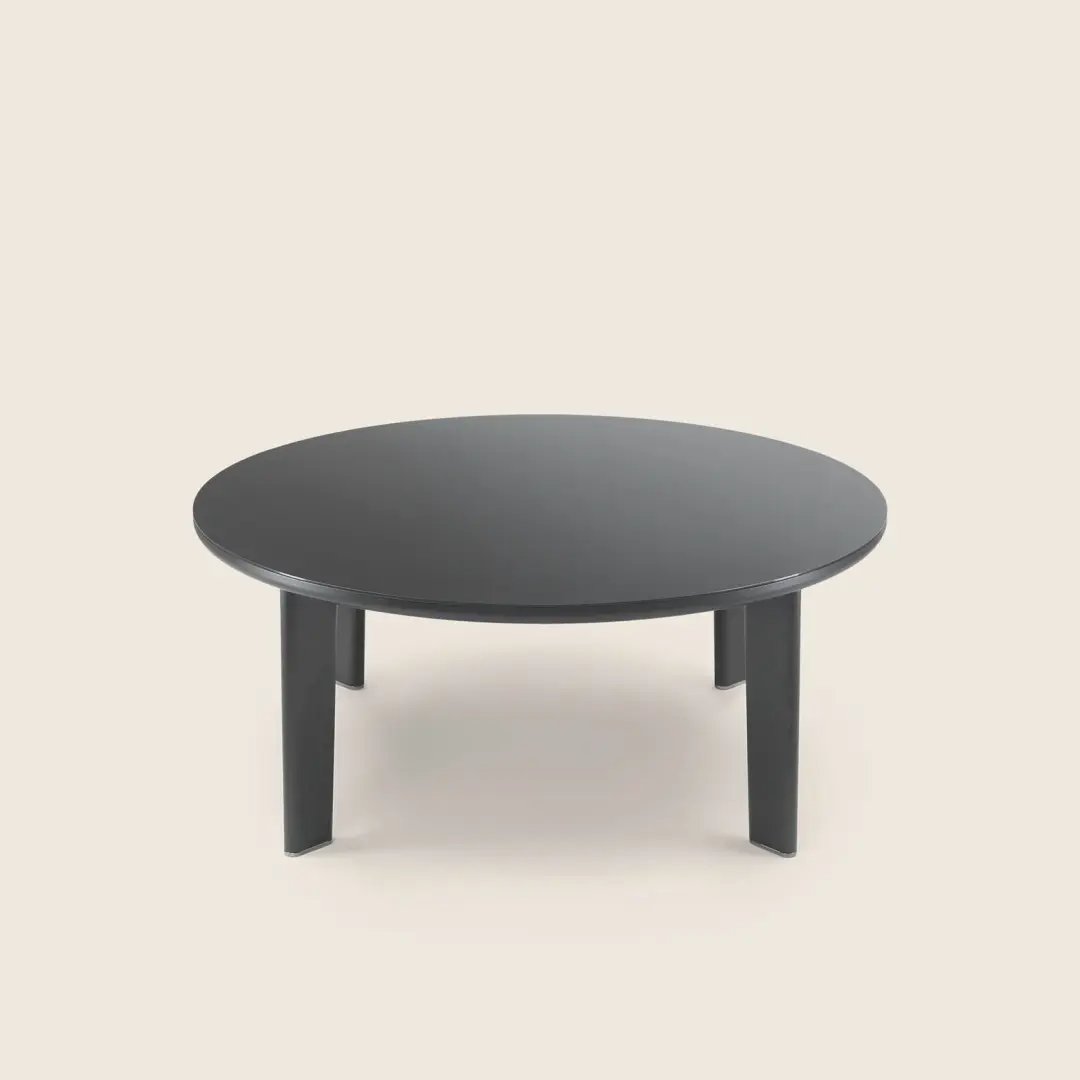 While the design is based on a single-material concept, in addition to veneered wood, the tabletop is also available in back-painted glass, in a palette of sophisticated colors.