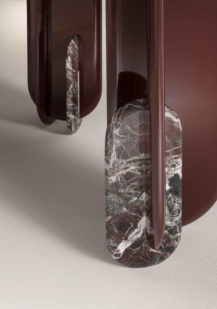 Table with rounded wooden top and modular legs with rounded section available in marble, natural, glossy lacquered and metallic lacquered wood. It is available in the round, rectangular or square version, and can be equipped with a Lazy Susan accessory.