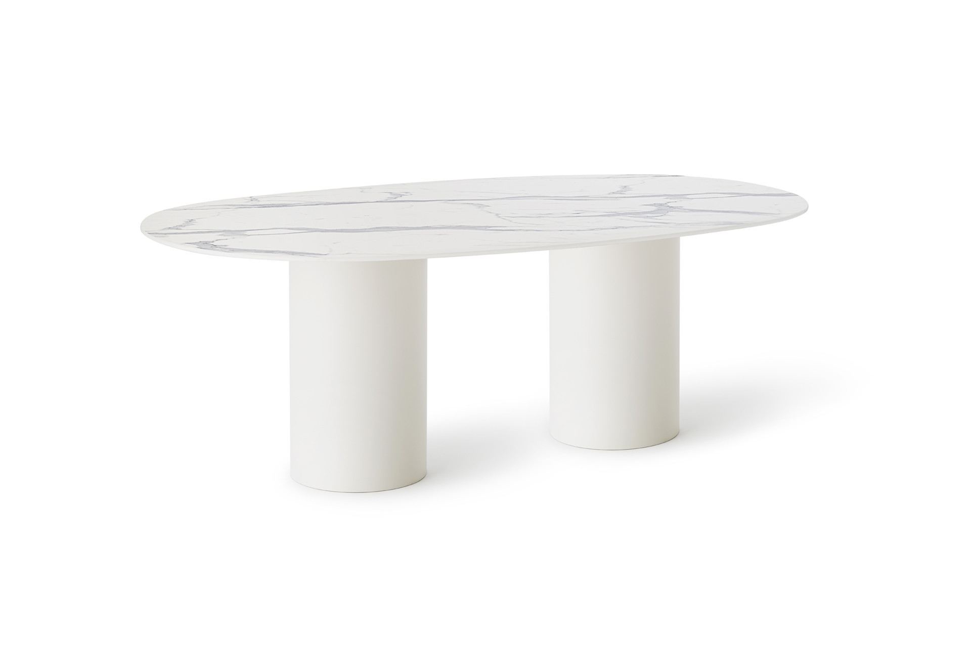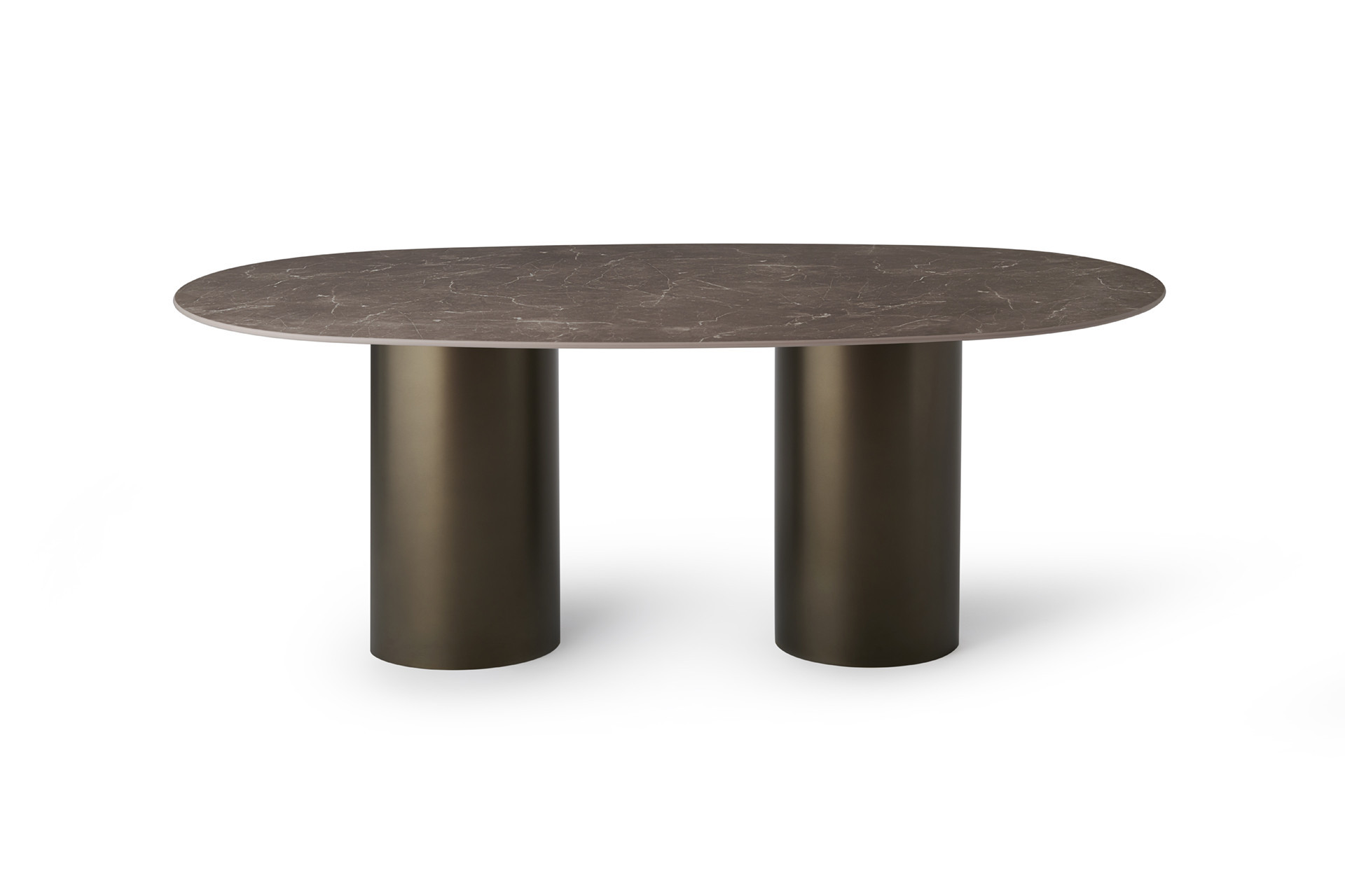 Tavolo ovale con base in lamiera di acciaio inox Aisi 304 verniciato a polveri, top in HPL. Dal design minimalista e moderno, questo tavolo dalle dimensioni generose, si caratterizza per il doppio basamento cilindrico che lo rende protagonista del vostro living, grazie alla forte espressione dei suoi materiali.