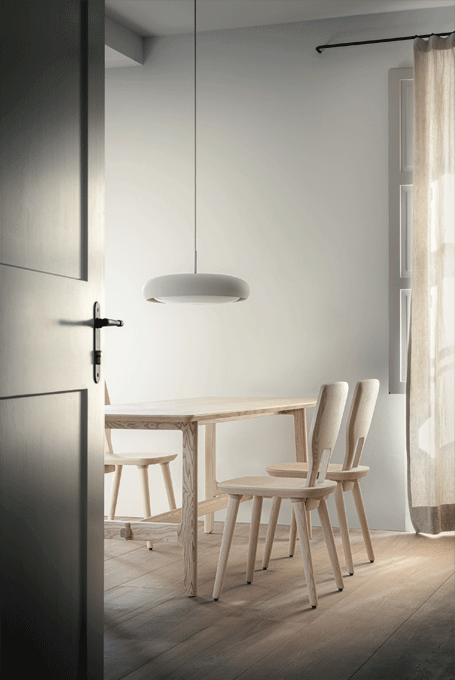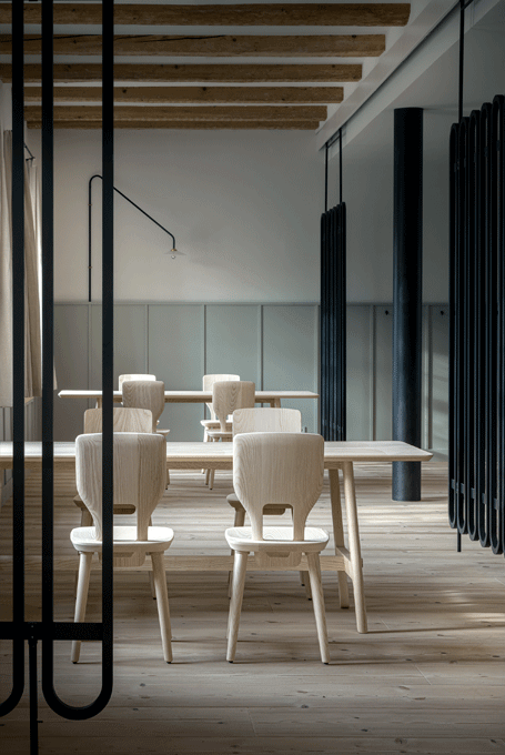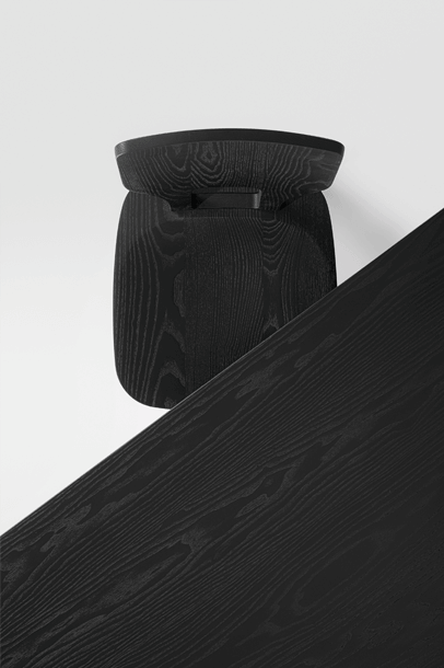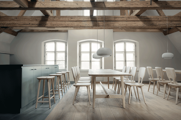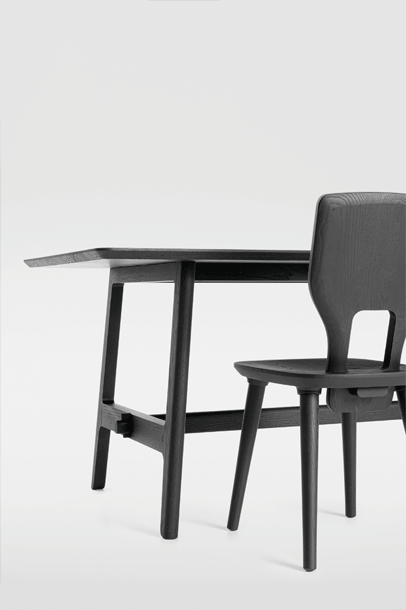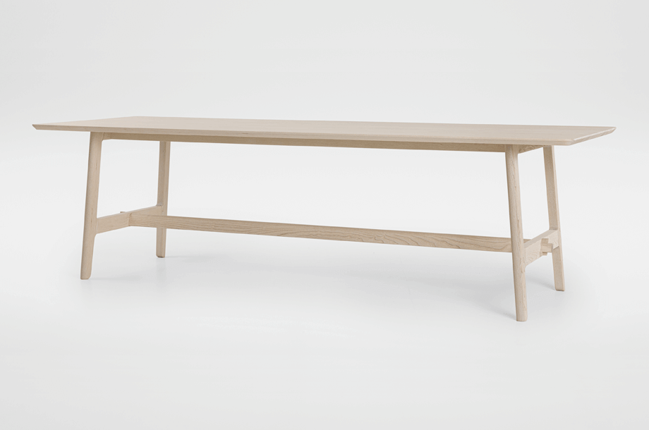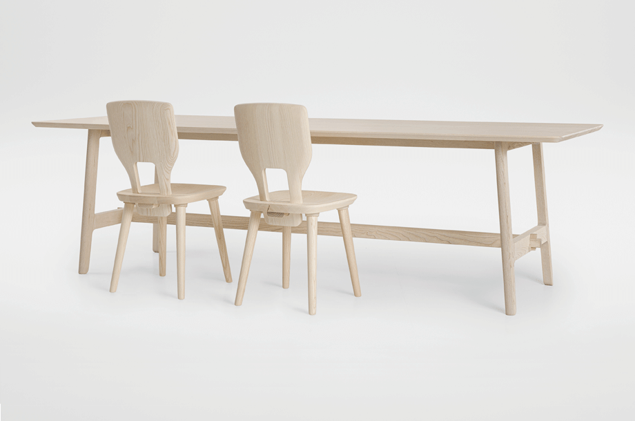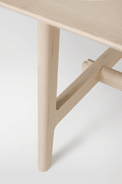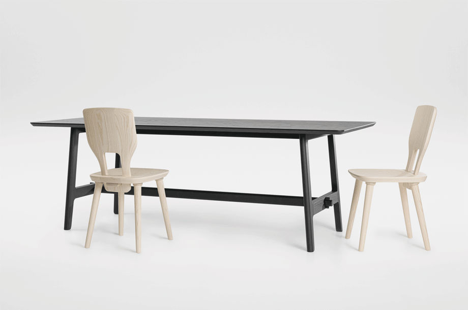 The basic design of the table is based on the plug-in connections of the VNA CHAIR stabelle. The cross frame and the associated visible wedging are typical of the Alpine region. The lateral H-shaped constructions are connected to the foot frame.