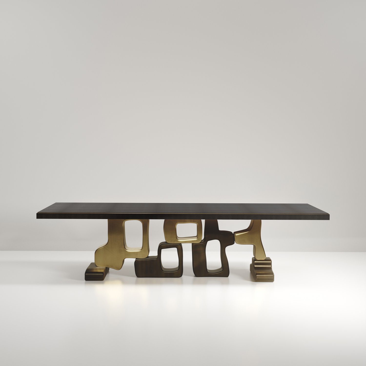 The Apoli II dining table by Kifu Paris is both dramatic and organic its unique design. The black pen shell inlaid top sits on a long clustered geometric and sculptural bronze-patina brass base. This piece is designed by Kifu Augousti the daughter of Ria and Yiouri Augousti. Part of the Apoli Capsule Series, see images of collection at end of slide.