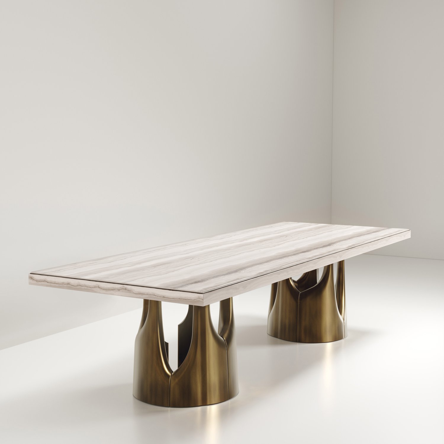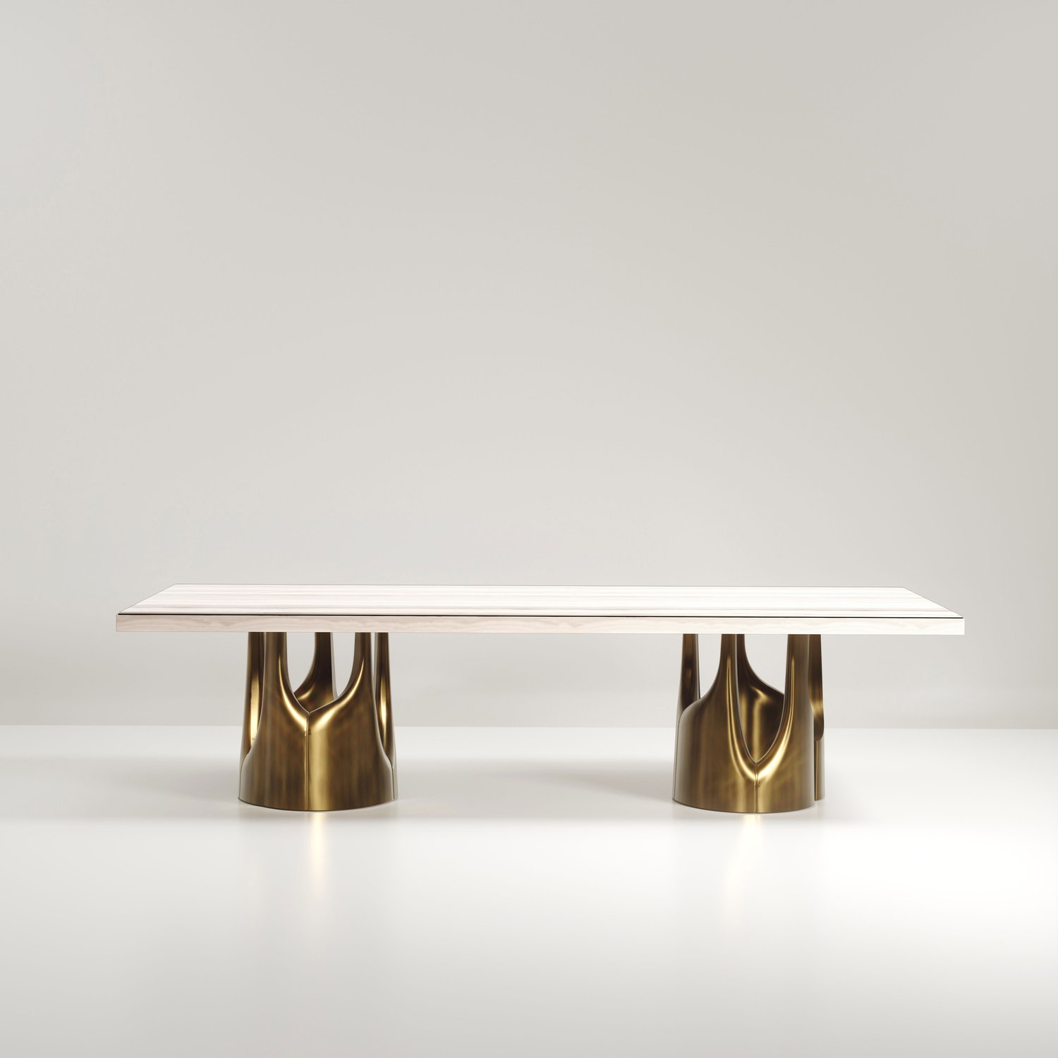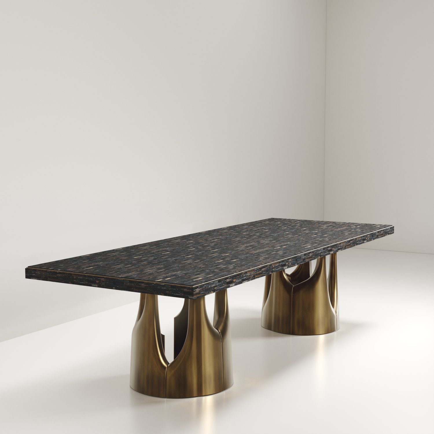 The Triptych I Dining Table by R&Y Augousti is a stunning multi-faceted sculptural piece. The beautiful hand craved details on the long clustered bronze-patina base demonstrate the incredible artisan work of Augousti.