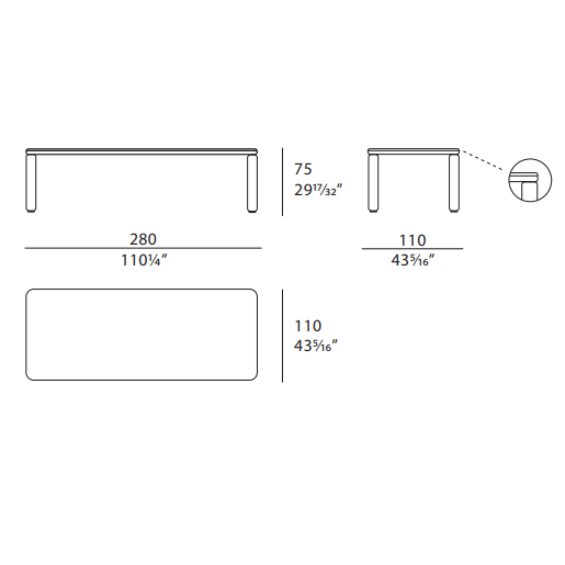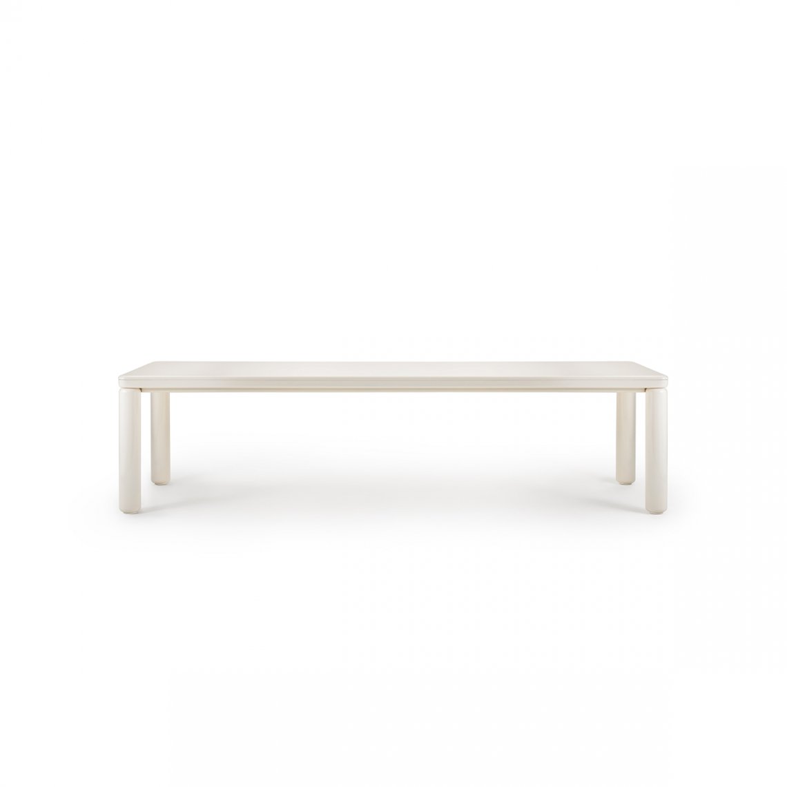The Roma table, rectangular but with a rounded design, has a top with rounded corners and cylindrical legs, and is made entirely of single-color lacquered wood. The Roma table is available in different finishes as per sample card.