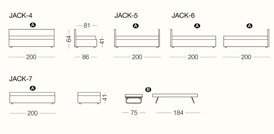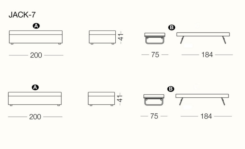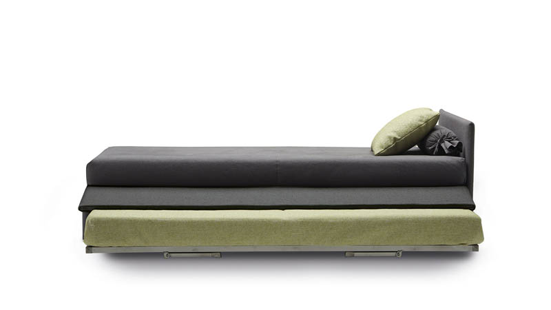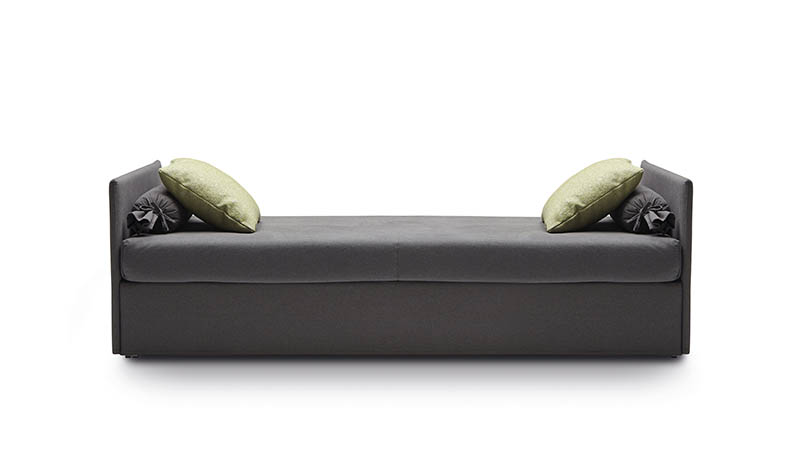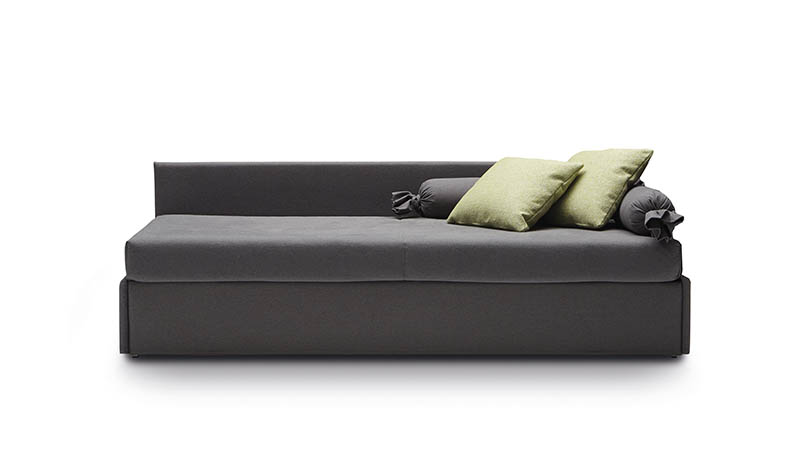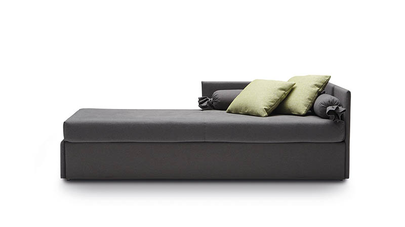 Jack is a practical and versatile sofabeds program, including models with calm or romantic designs adapting to any furnishing need. Jack is offered in multiple versions: sofa, chaise, bed with slatted base, with headboard, with footboard, full, double or with drawers and can therefore suit many environments such as a colorful child’s bed, a comfortable den or simply to be used as a family room that offers a comfortable guest bed when needed. Jack may be adorned with a large variety of cushions types according to your own taste and with a second bedspread for the pullout bed.