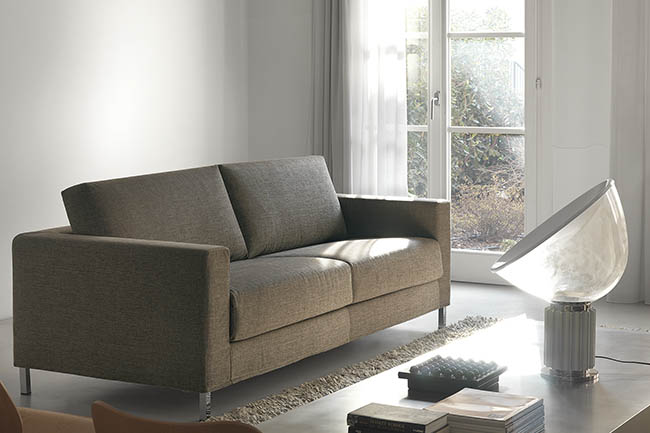 James combines innovative design and contemporary style, featuring 12 cm. legs in hammered silver metal. The bed with its mattress folds out effortlessly without the need to remove the seat and back cushions. The height of the legs makes it easy to clean under the sofa. The legs are also available chromium plated and in wengé, cherry or natural finish.