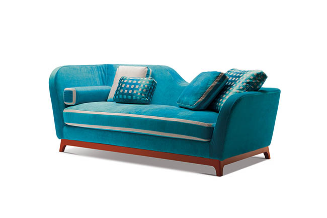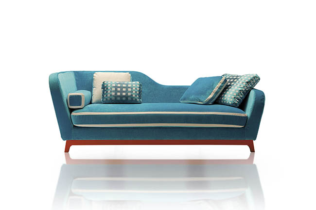 With its unique daybed shape, Jeremie recalls the Art Deco style, emphasized by its three variants: “Trendy”, turquoise fabric with special white details and orange base, “Fashion”, in shades of deep pink with floral patterns, striped details and green base, “Glamour”, in elegant taupe and brown colours. Featuring a seat in feather and high resilient polyurethane foam, feather backrest pillows and solid beech wood base in standard wenge finish or RAL color on demand, Jeremie is available in two widths, 214 cm and 228 cm and in several contemporary or classic fabrics. Jeremie is also available in bed version with a 190 cm long mattress.