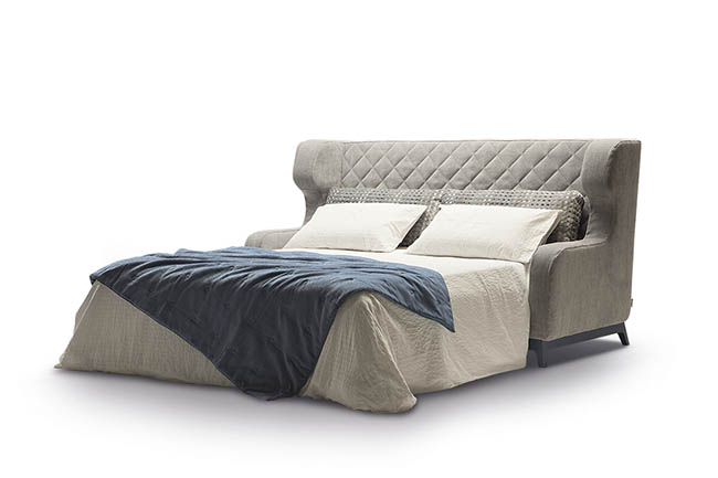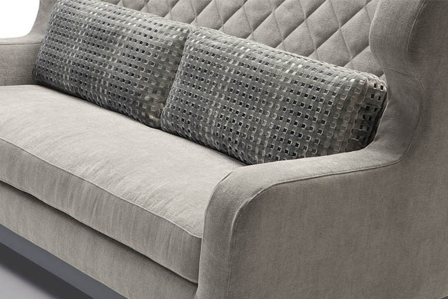 Morgan is distinguished by its Art Deco design and for the high back, creating a modern Bergère; the well-proportioned volumes combine classic and contemporary tastes. Morgan is ideal for decorating the home environment, lobby areas and the receptions of hotels and offices. Featuring a seat in feather and high resilient polyurethane foam, feather backrest pillows and solid beech wood base in standard wenge finish or RAL color on demand, Morgan is available in three widths: 222, 208 and 178 cm and in several contemporary or classic fabrics. Morgan is also available in bed version with a 190 cm long mattress.