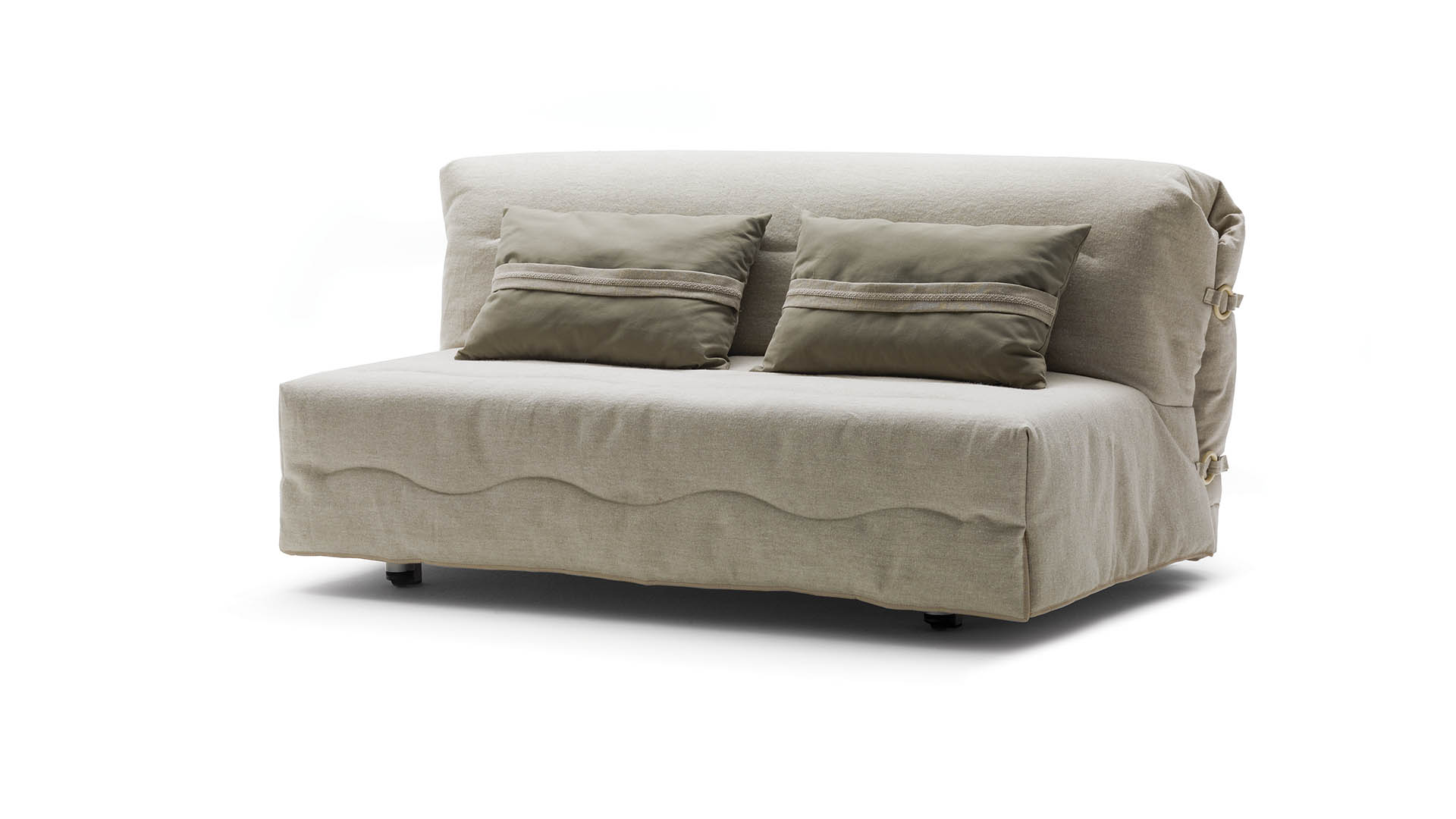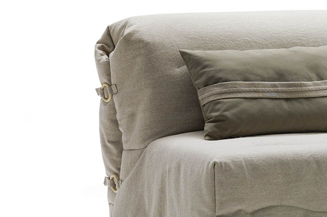 Roger retains a simplicity of line, with an original approach to the detailing of natural wood rings of its quilted covering. Roger has a practical front pull-out bed. Covers are completely removable and can be dry cleaned. Roger has a mattress made in undeformable foam covered with a quilted fabric. Roger can be put together with a headboard with a removable cover, washable according to the fabric chosen.
