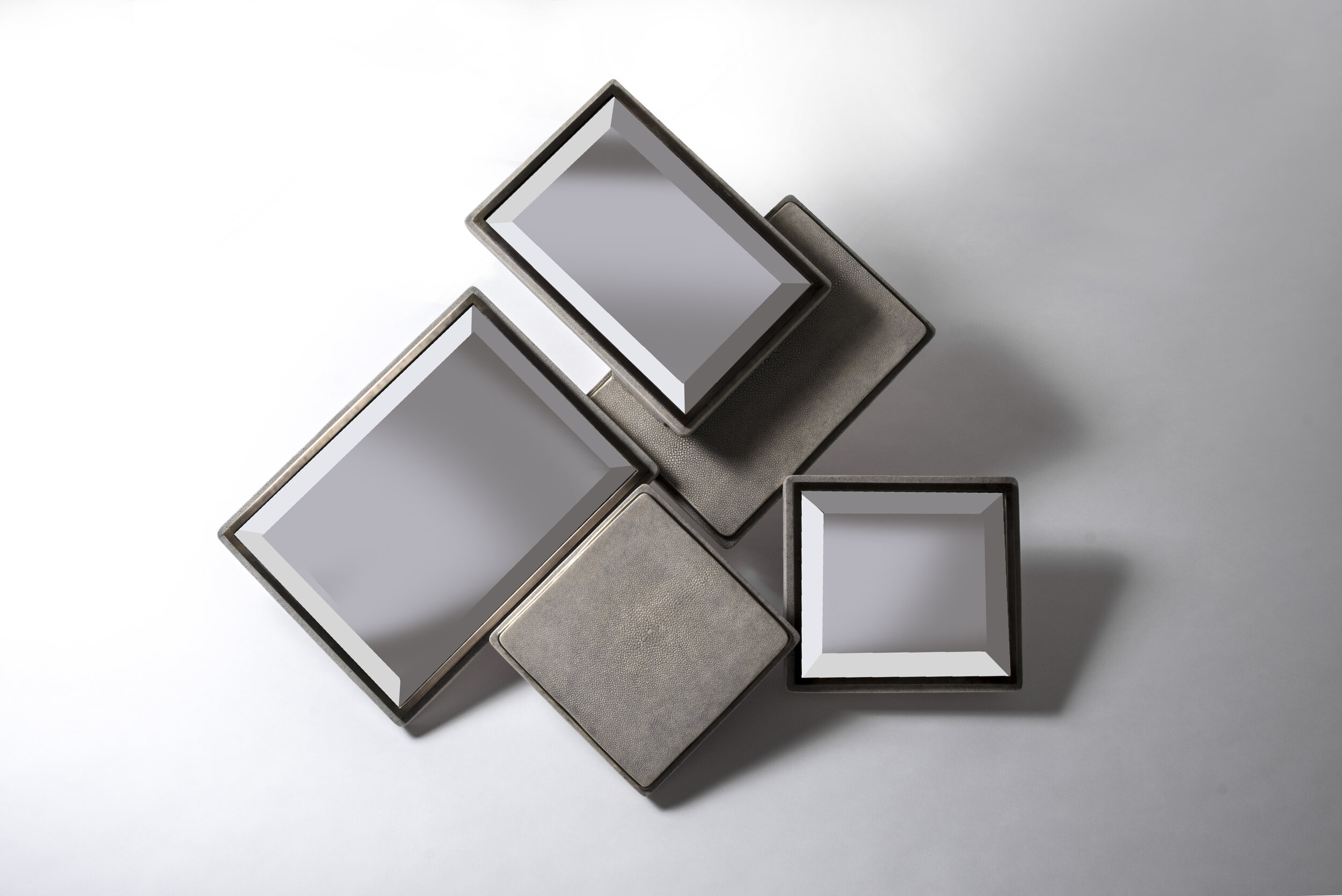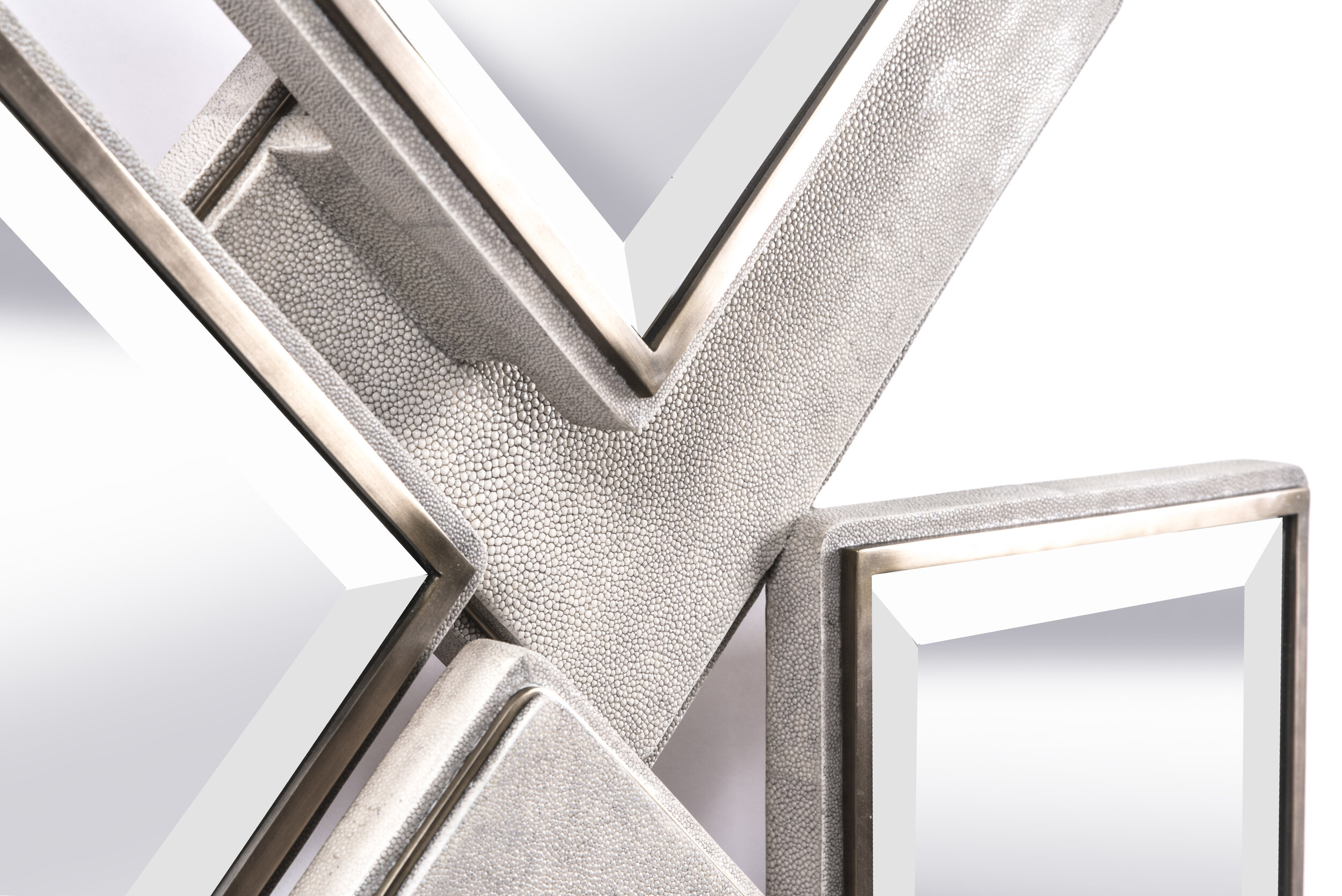 The Mondrian Mirror Large is a playful graphic piece with it's geometric mixture of mirror parts and cream shagreen parts that are placed on different levels. The shagreen parts have a discreet metal indentation detail adding another element of luxury to the piece. This mirror can be hung different ways to create a different expression each time. The shagreen is hand-dyed by artisans creating a one of a kind piece each time.