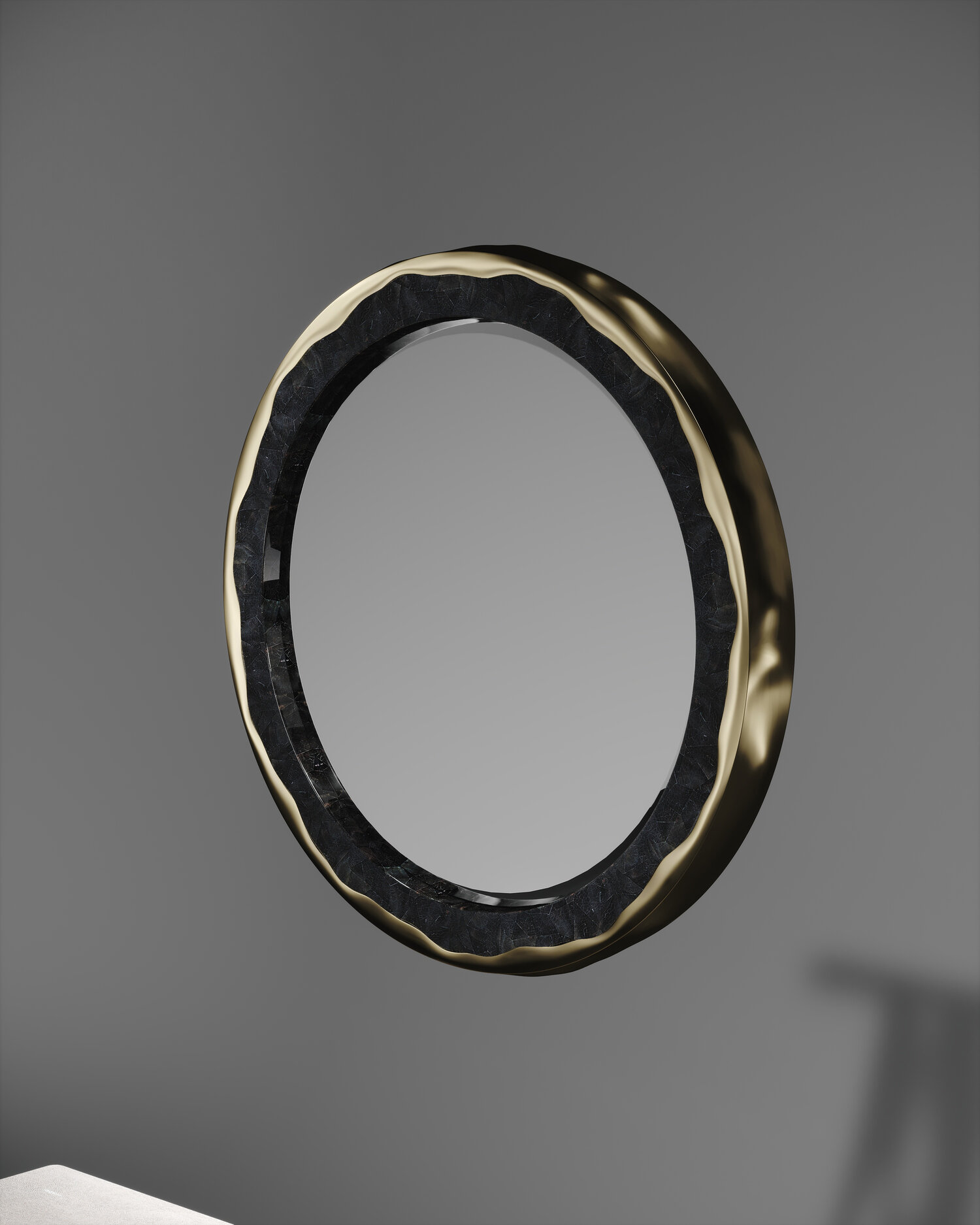 The Melting Mirror by R&Y Augousti in cream shagreen and bronze-patina brass, is an iconic piece of theirs with their signature "melting" metal detail. Available in other finishes and a large size, as well as a "cut out" version.
