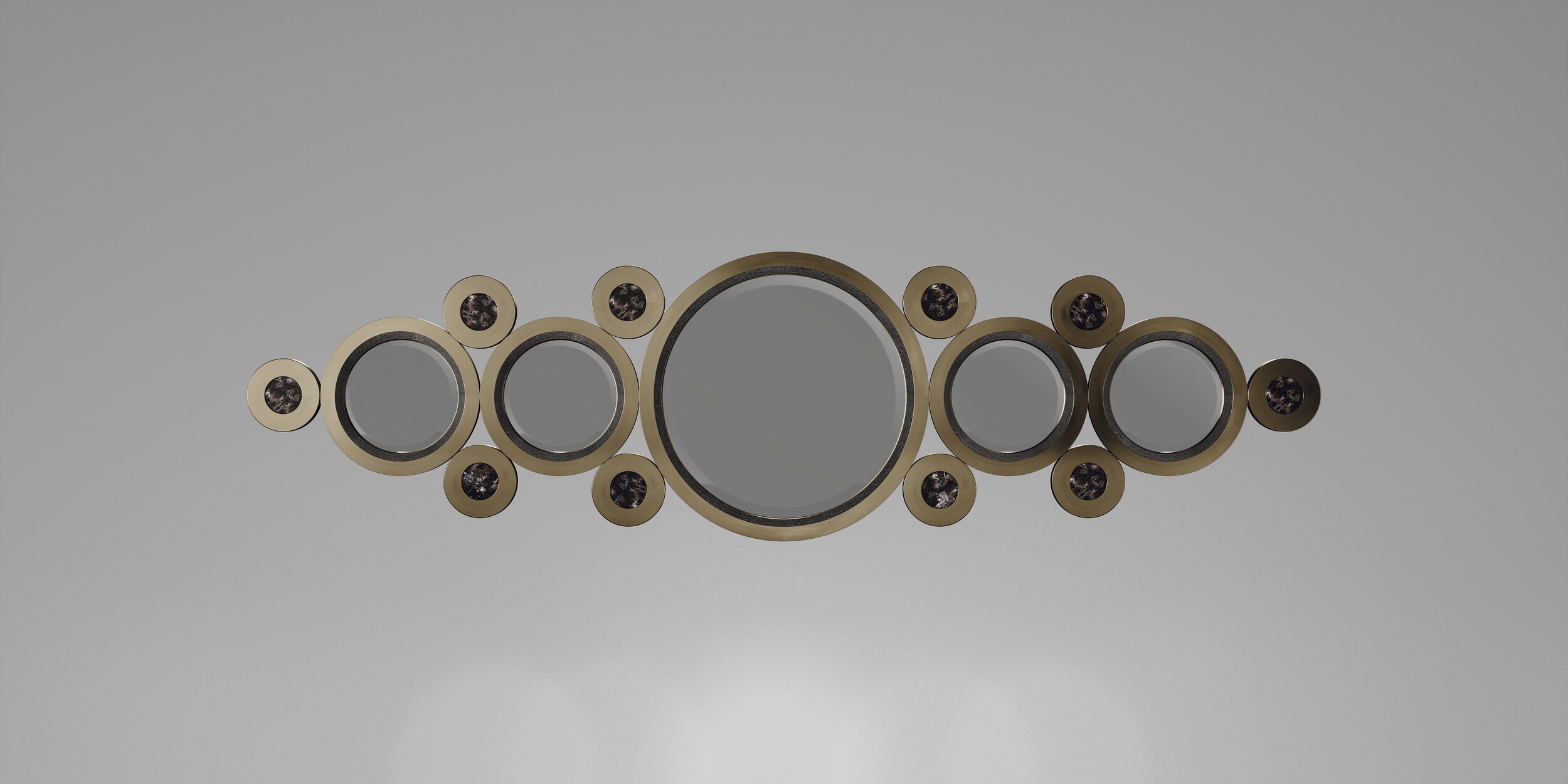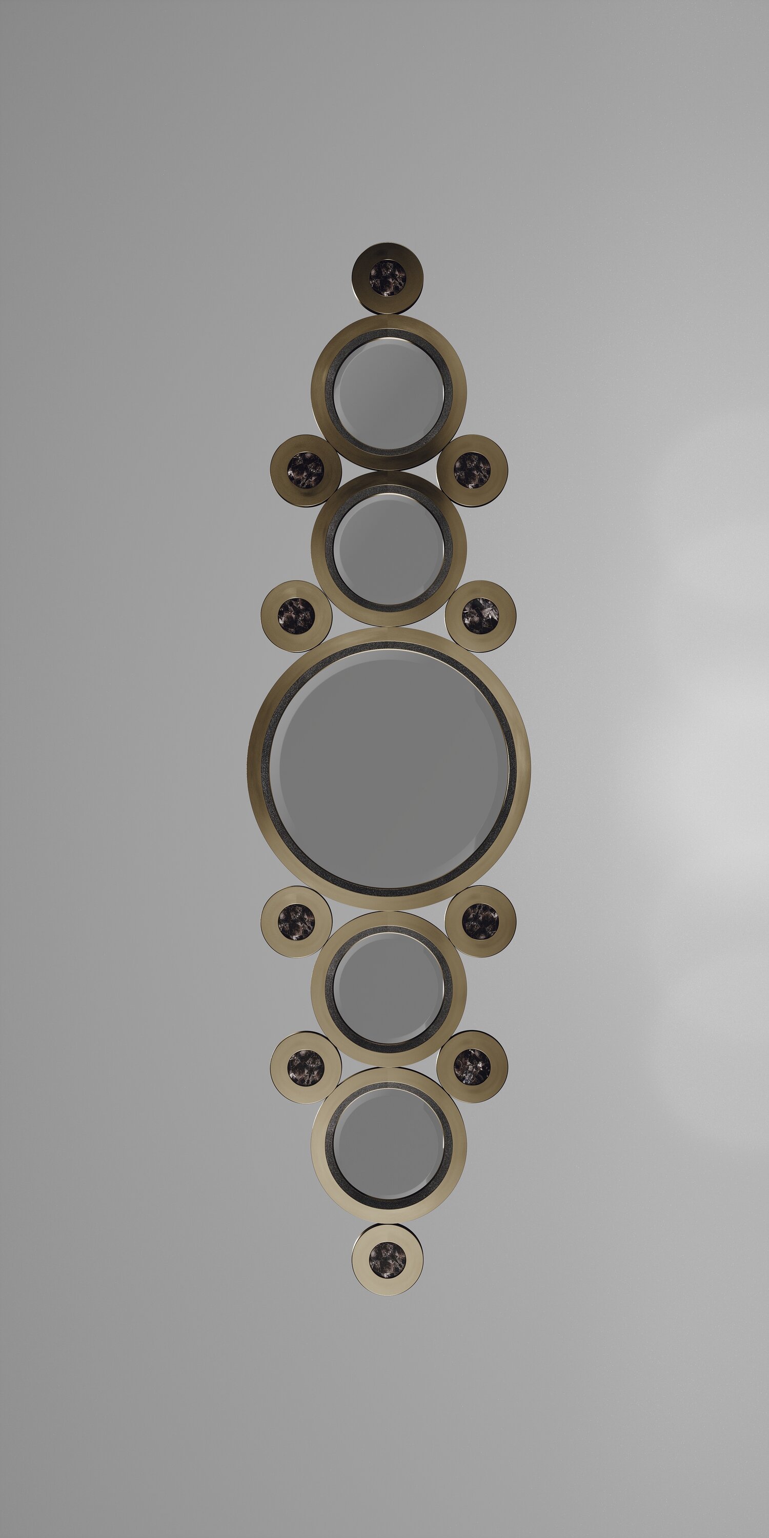 The circle mirror by R&Y Augousti in cream shagreen, white quartz and dark bronze-patina brass, is an archive piece of theirs from the 1990s. The statement wall piece adds drama and flair to any space and shows the richness of their incredible artisan work. This mirror can be hung on the horizontal or the vertical. Available in other finishes.