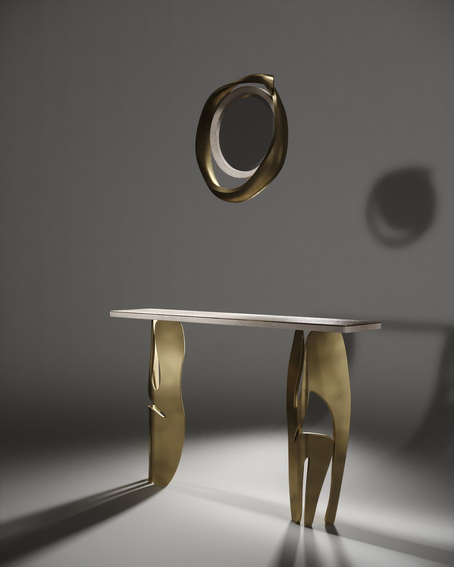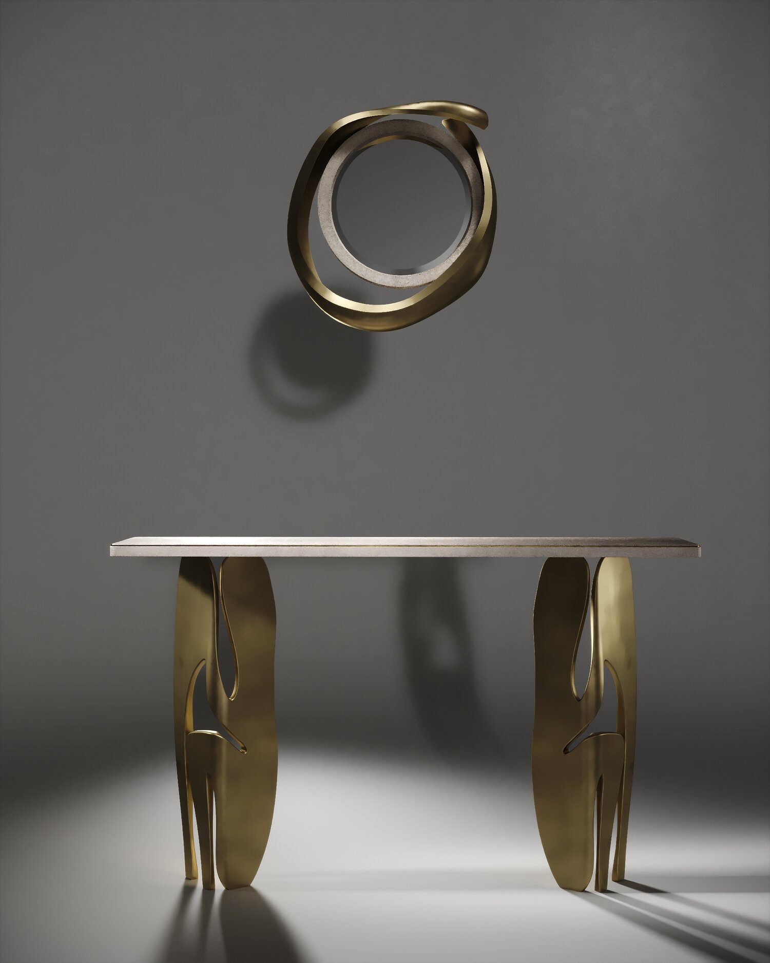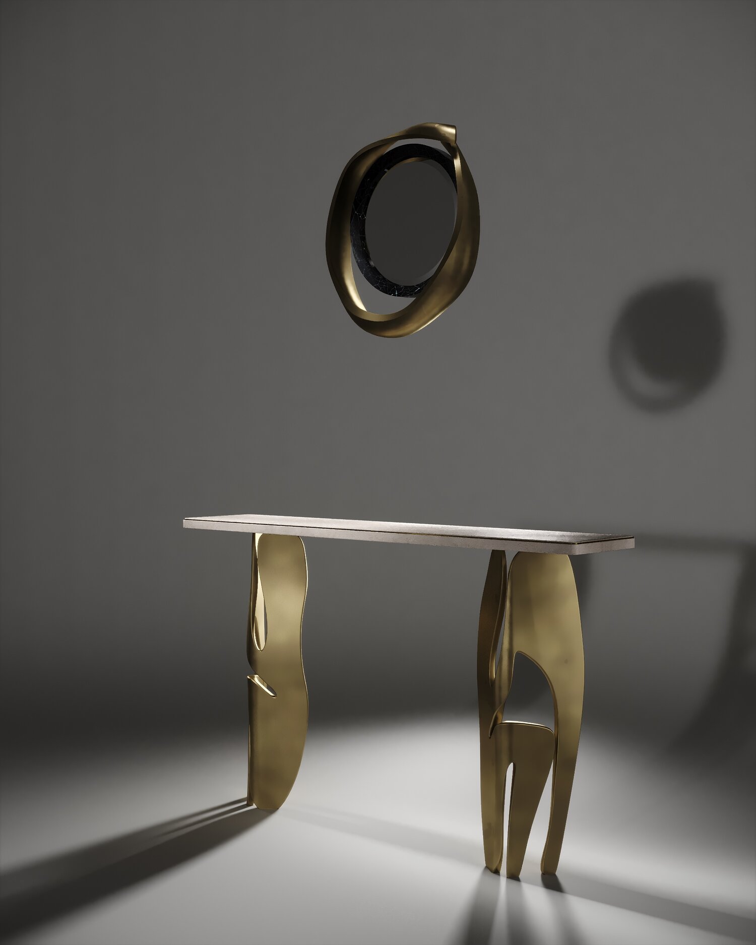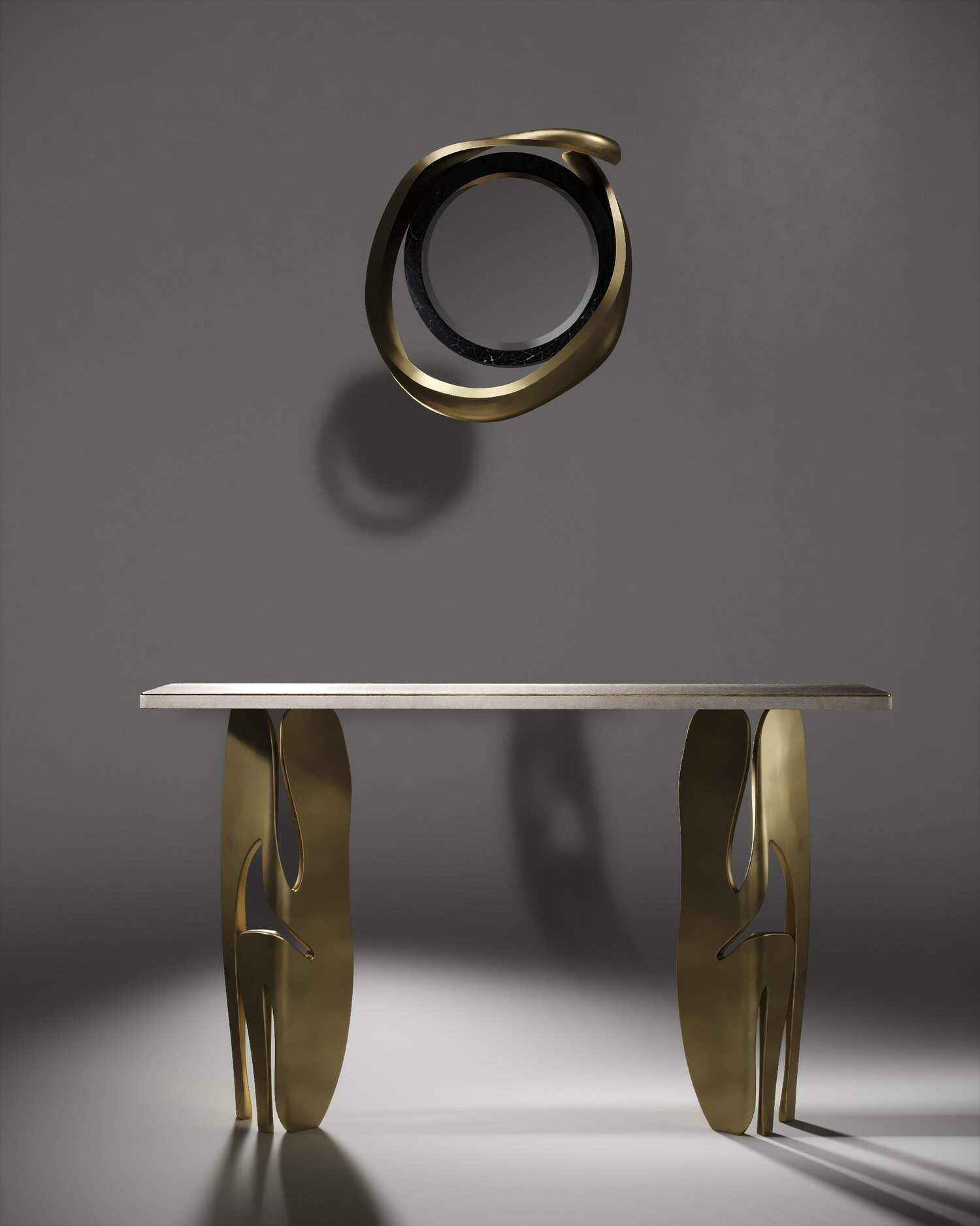 The Metropolis II mirror by R&Y Augousti in cream Shagreen and bronze-patina brass, is a sculptural piece of theirs and is an extremely versatile mirror. Due to the fixtures at the back this piece can be hung in three different ways creating a different expression each time with its amorphous and poetic shape. Available other finishes and a large size.