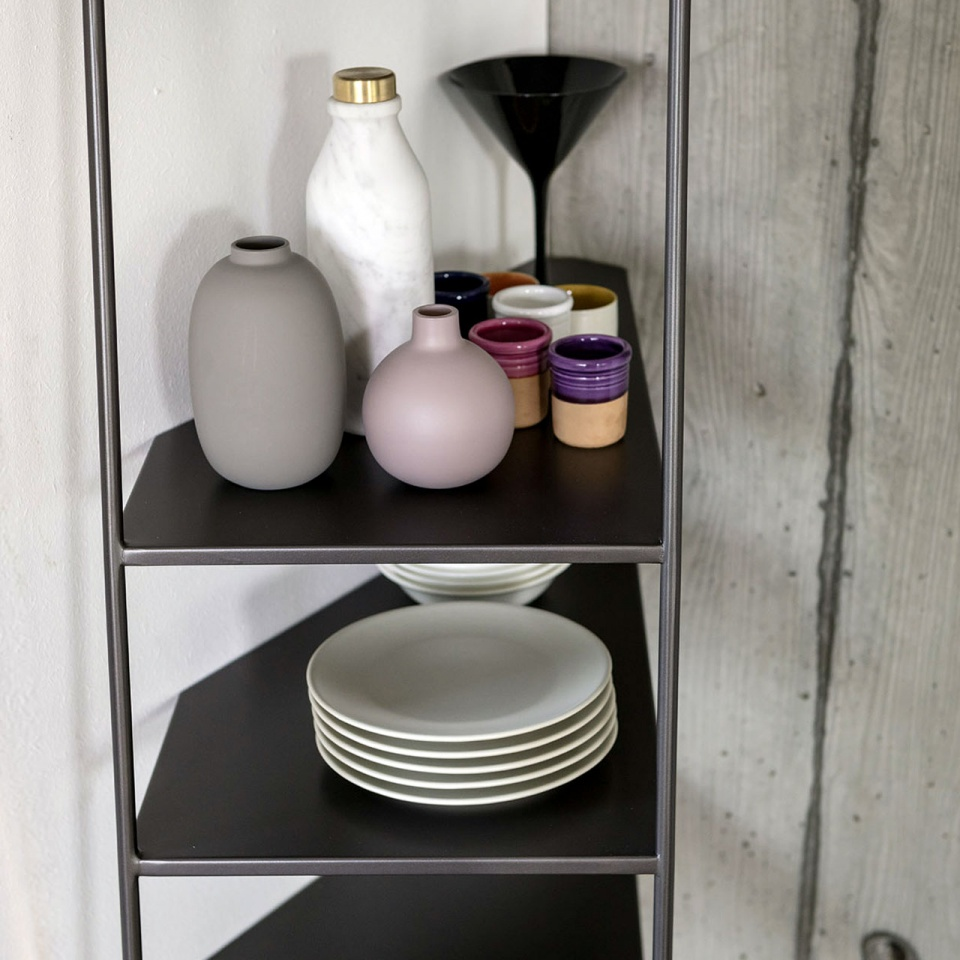 Adelaide è un’etagere con struttura in massello di legno di Iroko oppure in ferro verniciato nero opaco E’ completa di 13 ripiani, predisposta per il fissaggio a soffitto (altezza soffitto da cm 236 a cm 302). E’ una elegante libreria, terra cielo con un piantone girevole a base quadrata al quale sono fissati in maniera asimmetrica sui 4 lati i ripiani di due misure differenti (20x30 cm, 25x30 cm).