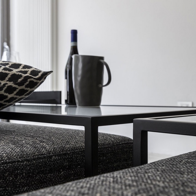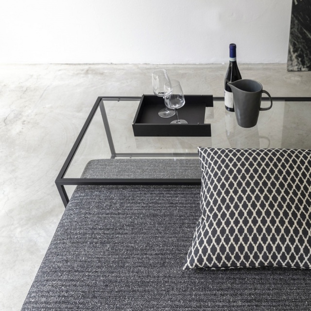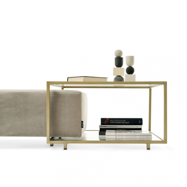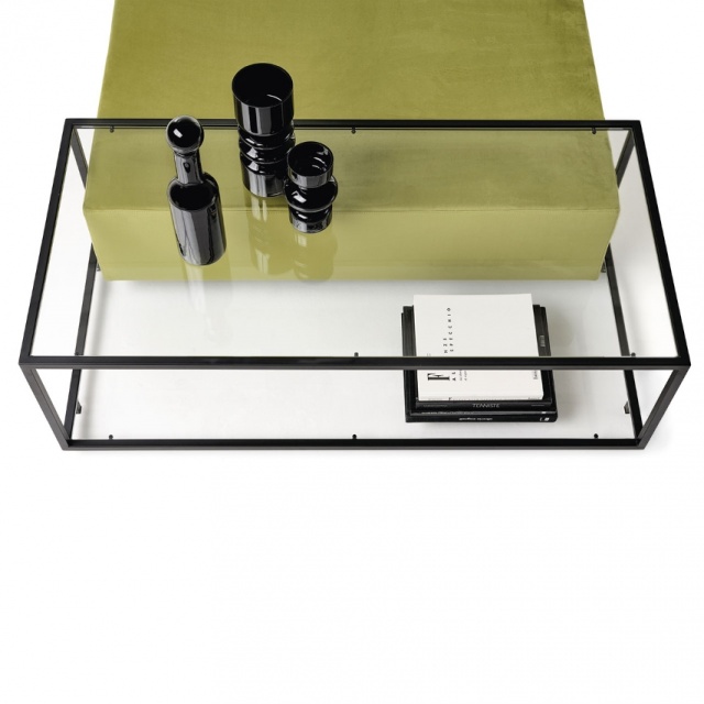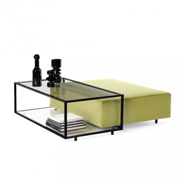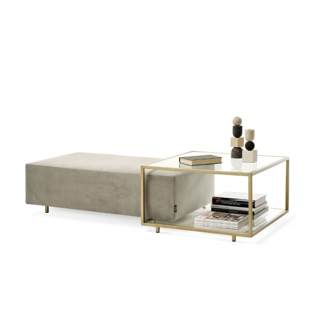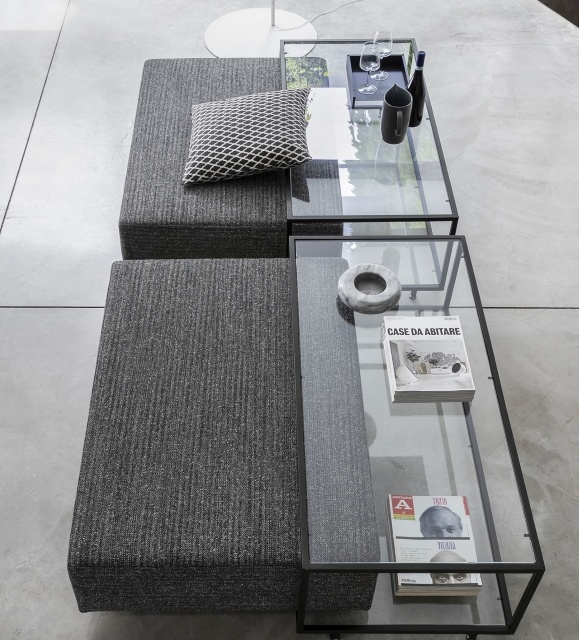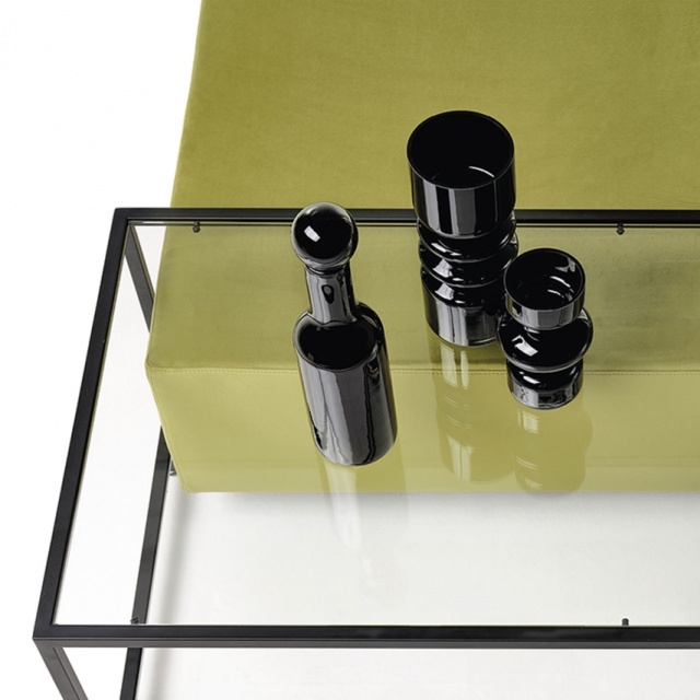 Zoom pouf is padded with removable cover, with coffee table with metal structure available in patinated bronze or black painted finishes complete of transparent glass top. A timeless classic, ideal in the living area as a seat and at the same time as a coffee table.