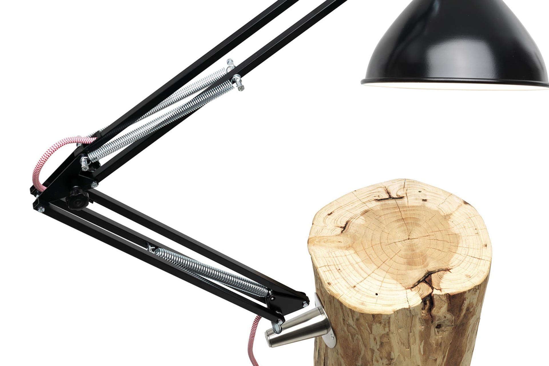 Piantama is a side table | lamp in solid wood complete with pantograph lamp available in white or black. Piantama is a successful combination of a natural element, the trunk, and the icon of the industrial metal lamp.