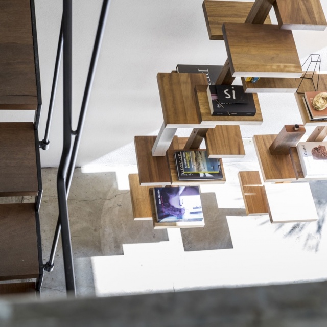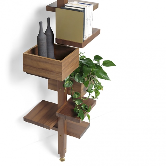 It is an elegant bookcase, forced between floor an ceiling with a vertical stick qith square section where are fixed asymmetrically on the 4 sides the shelves of two different sizes (20x30 cm, 25x30 cm). It is an element that can be used as a partition, as a bookcase able to personalize any environments also of the corners.