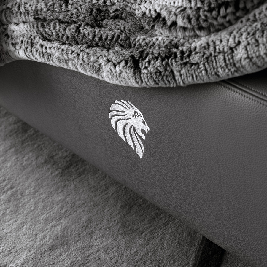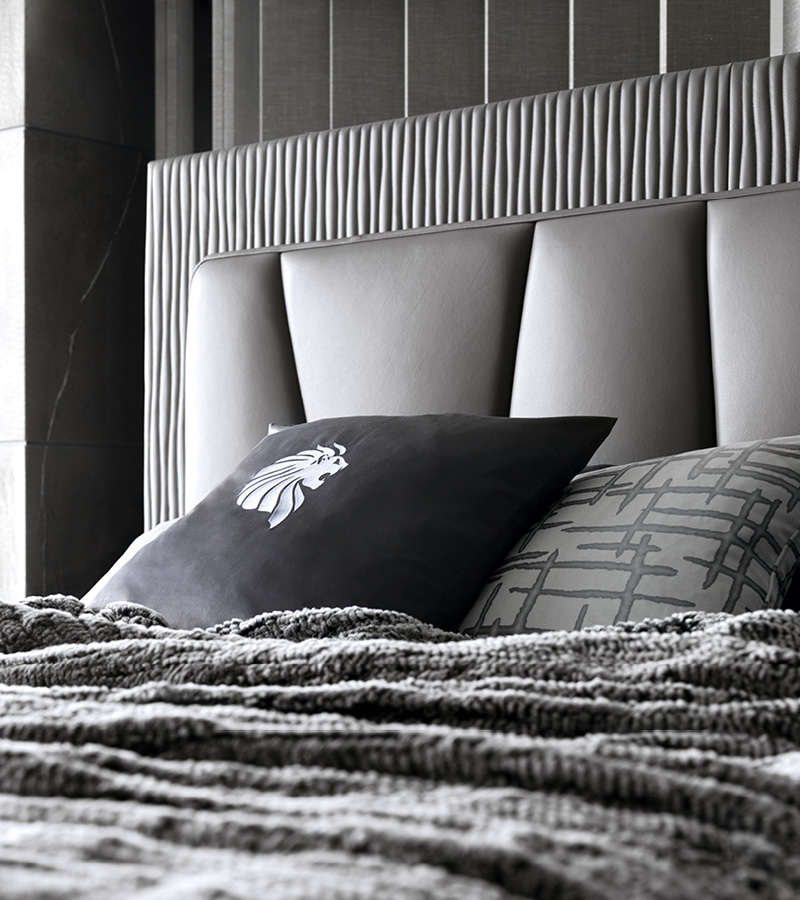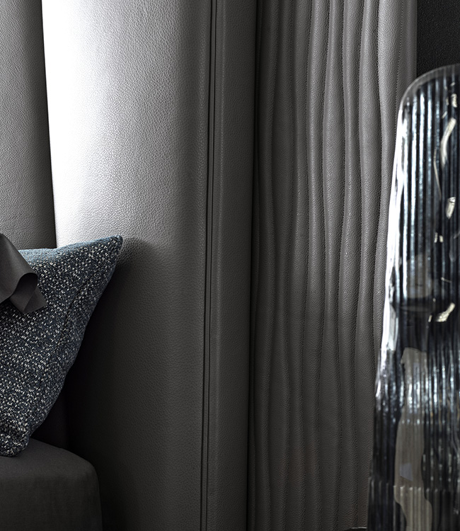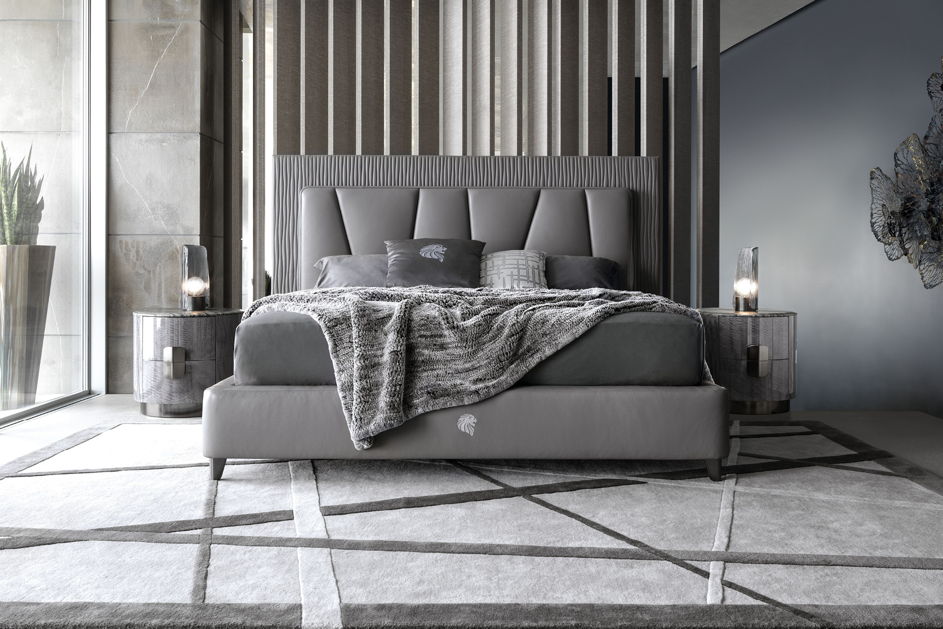 Fully upholstered bed in fìrst grade leather, nubuk leather, lizard printed leather, velvet or suede fabric. Footboard with Giorgio Collection logo. Quilted headboard. Legs in satin black nickel stainless steel.