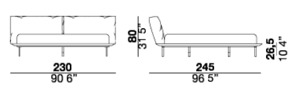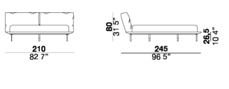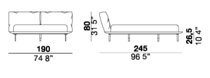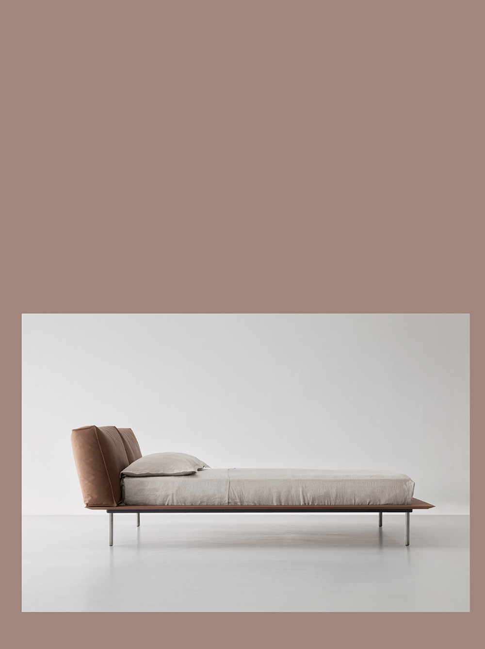 Vogue cuoio bed with a metal headboard upholstered with expanded polyurethane foam covered with acrylic silicon fiber. The sommier is made of painted metal with a leather-covered wooden frame with cuoio finish available in three different leathers: Soffio, Setanil and Natural Velour. The metal feet are available in bright chromed or black chromed. If no preference is specified, the edges feature tone-on-tone lacquering. Mattress is not included. Please note: single wooden slat included in the bed.