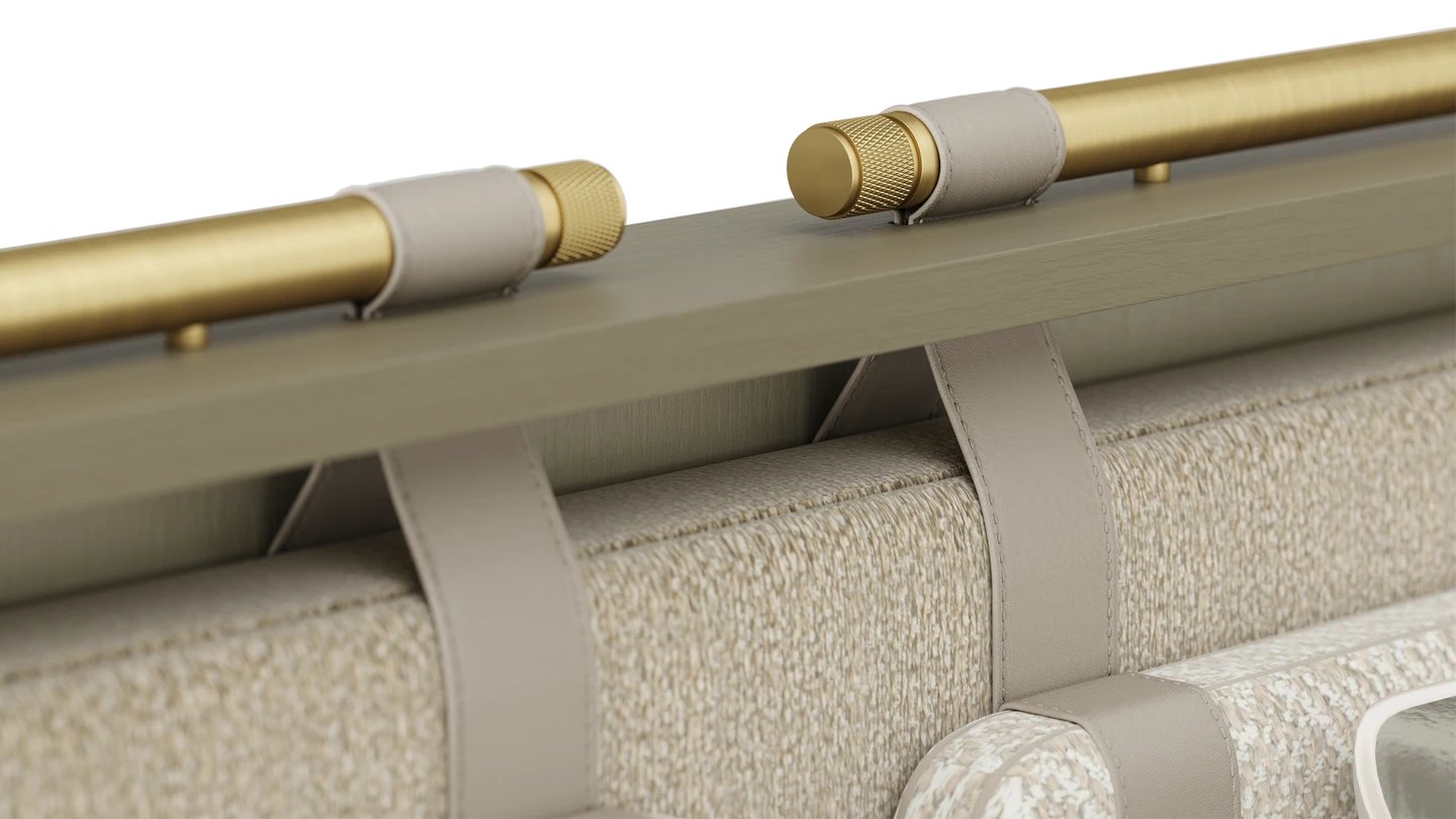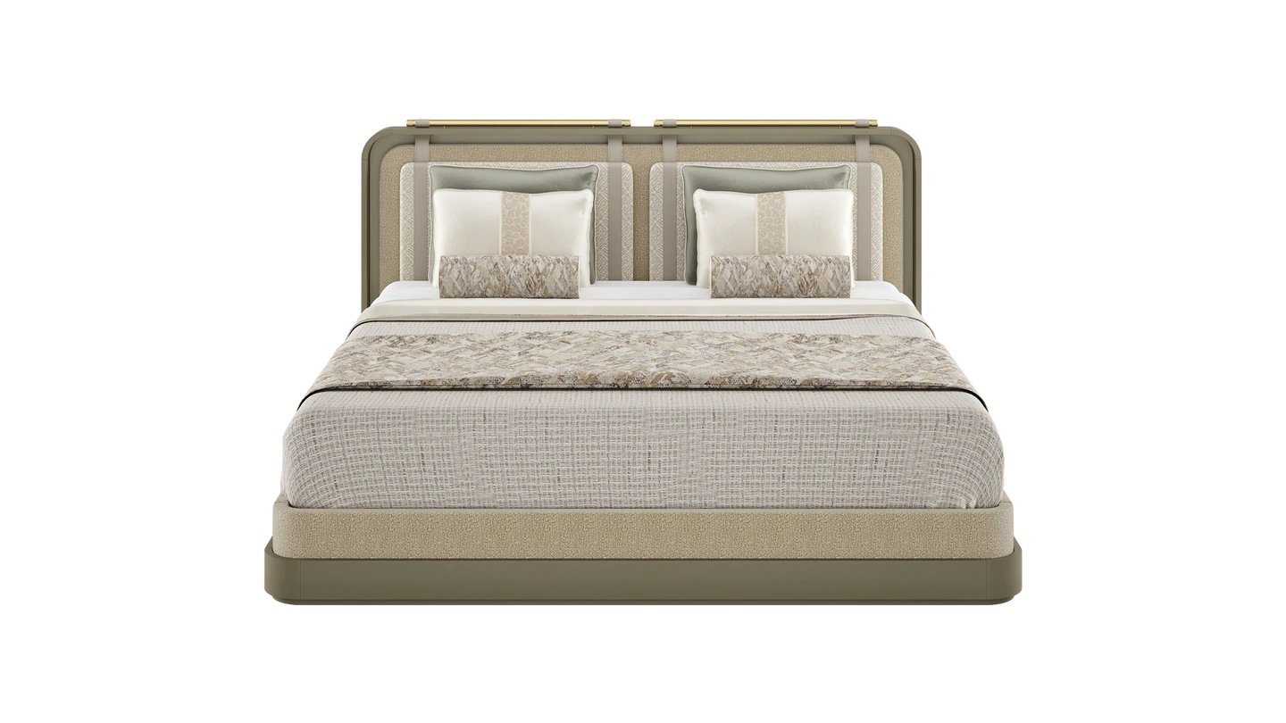 Let our LAMU Bed take centre stage in your bedroom. The commanding shape features a solid base and encompassing headboard, both finished in fabric. Leather and brushed brass details give it the perfect finish.