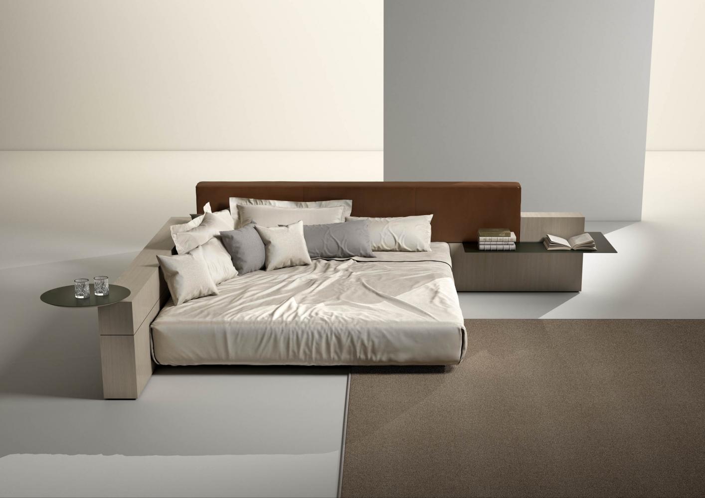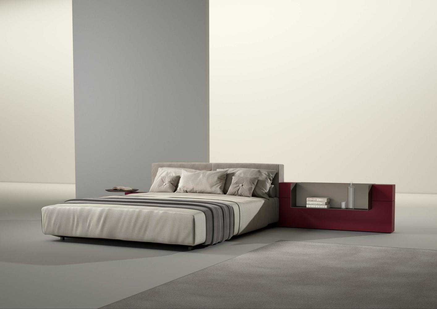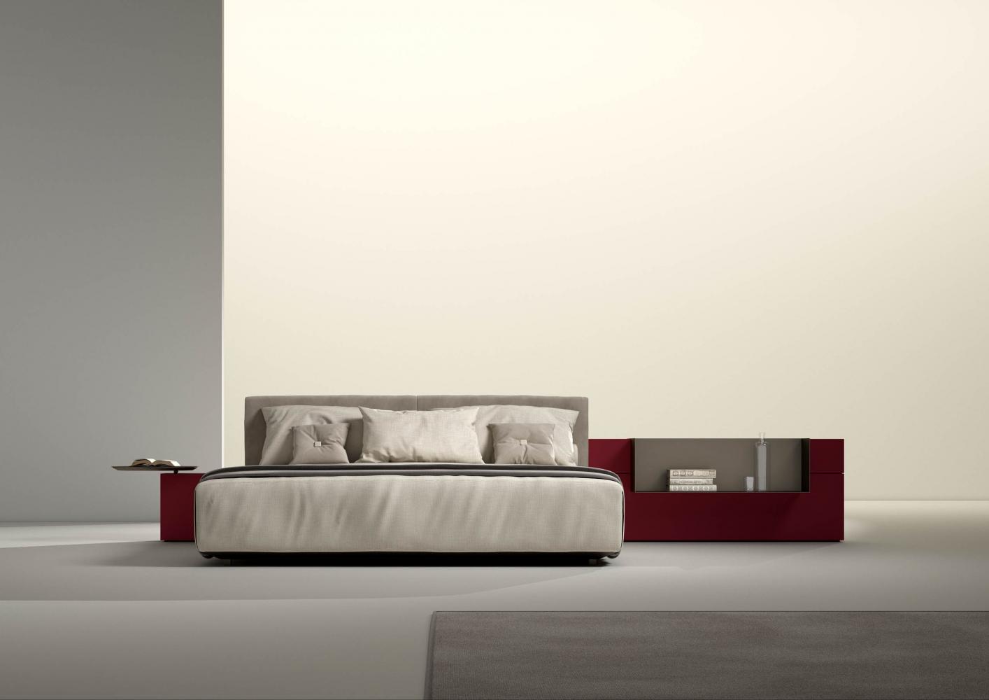 Thanks to the range of accessories, shelves and open storage units you can customize the different compositions. The various finishes available for the headboard characterize the taste and aesthetics of this bed system conceived in continuity with the "Symphony" storage system, designed for the living space.