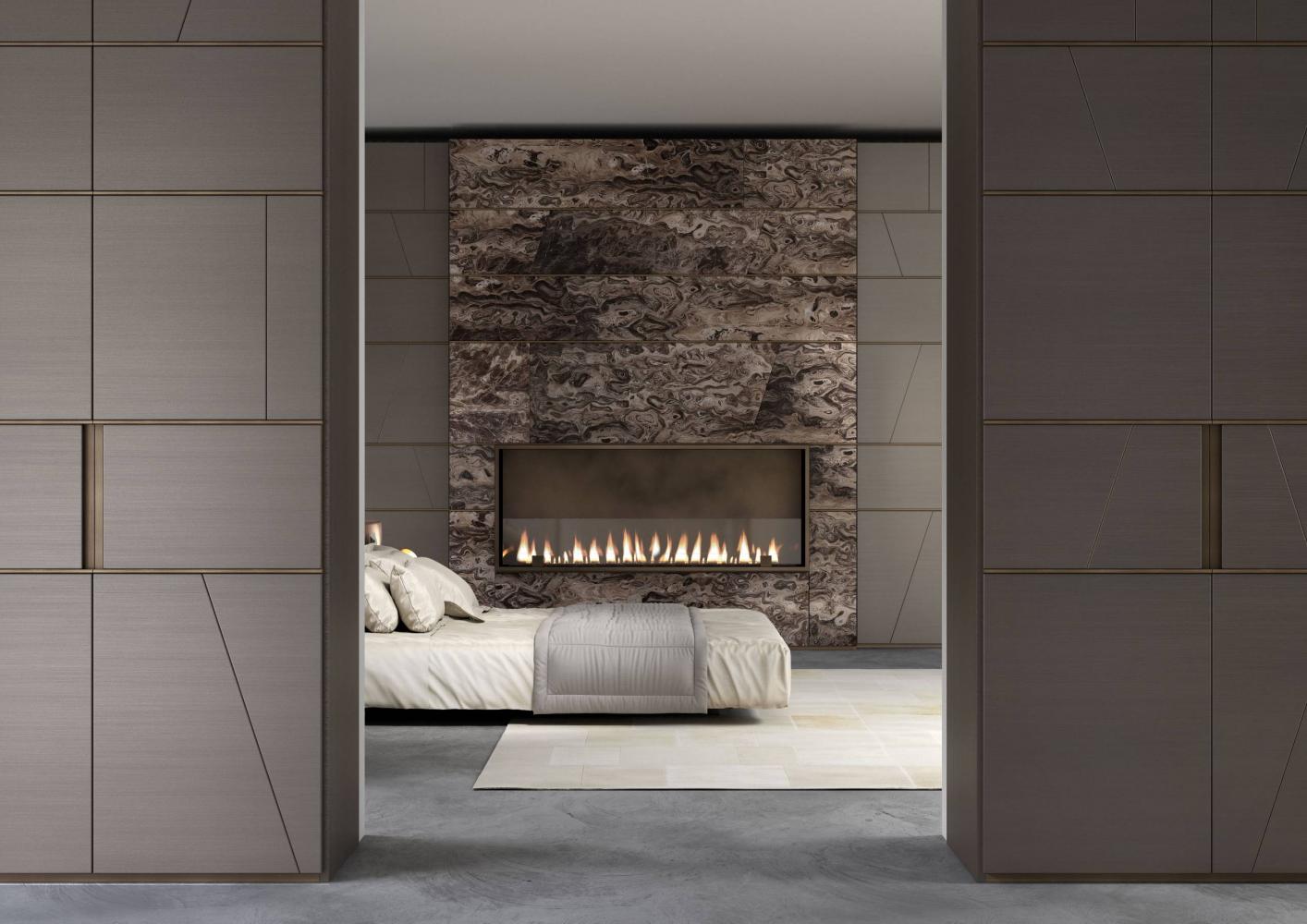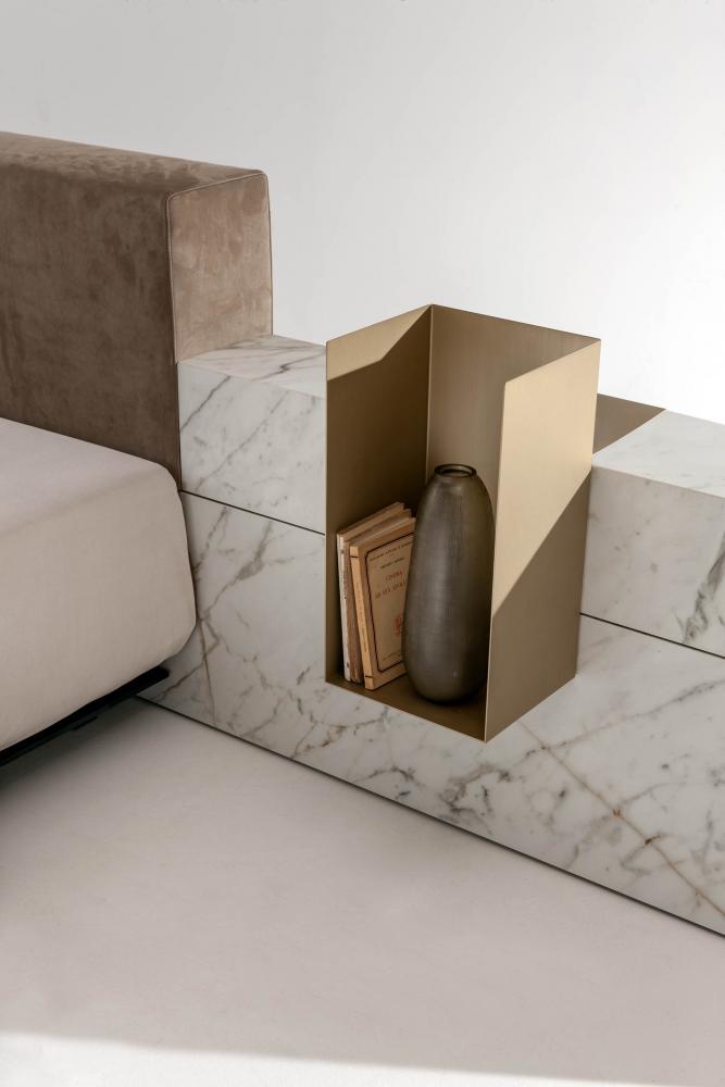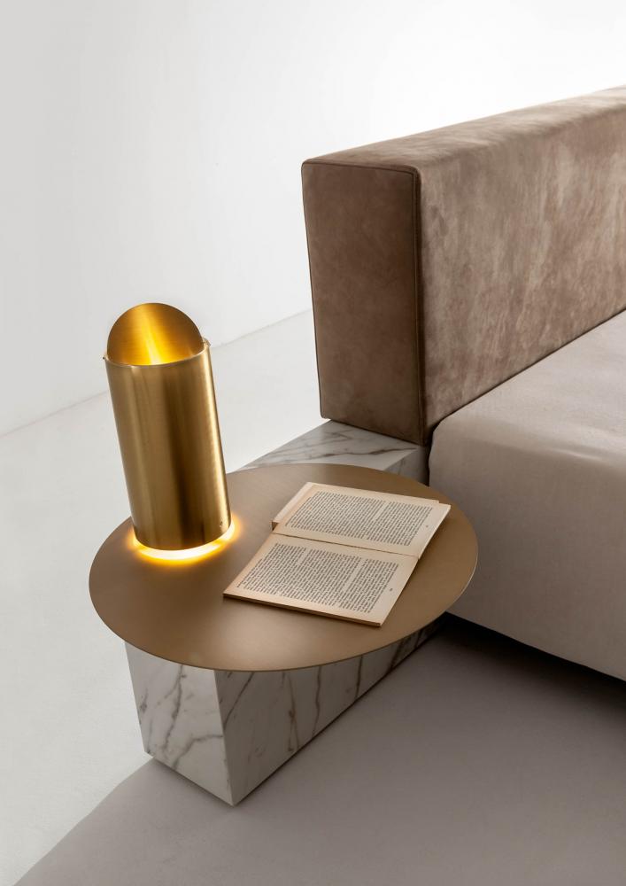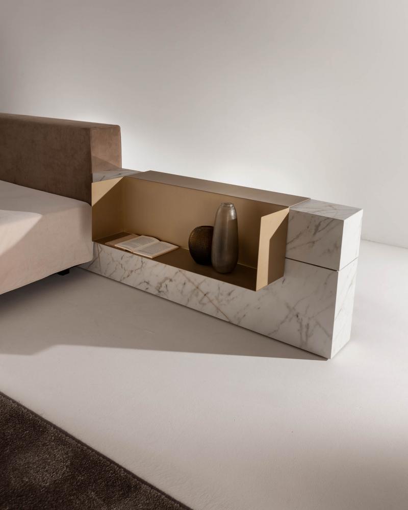 Thanks to the range of accessories, shelves and open storage units you can customize the different compositions. The various finishes available for the headboard characterize the taste and aesthetics of this bed system conceived in continuity with the "Symphony" storage system, designed for the living space.