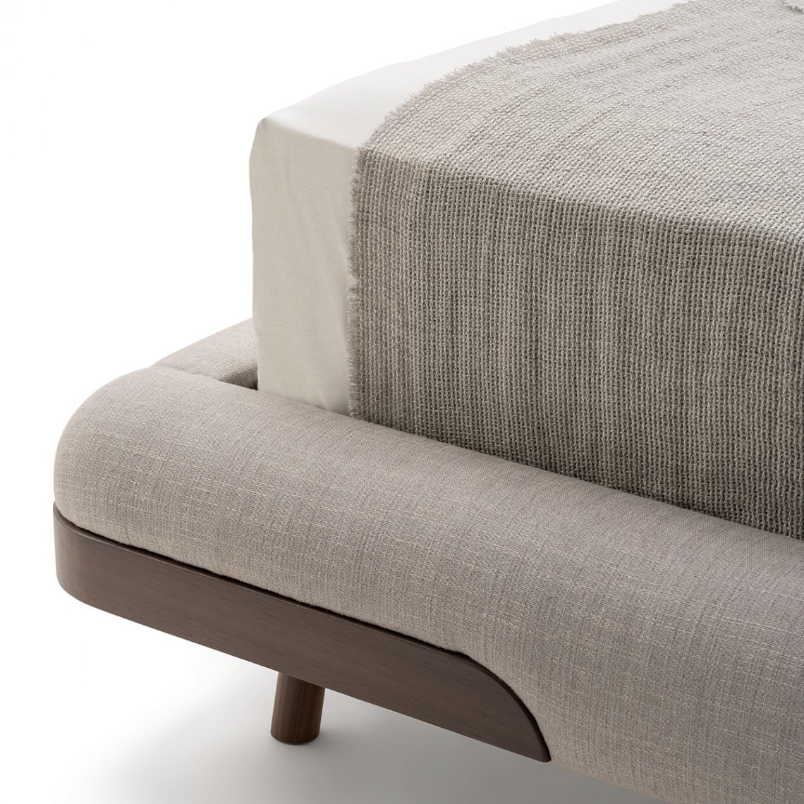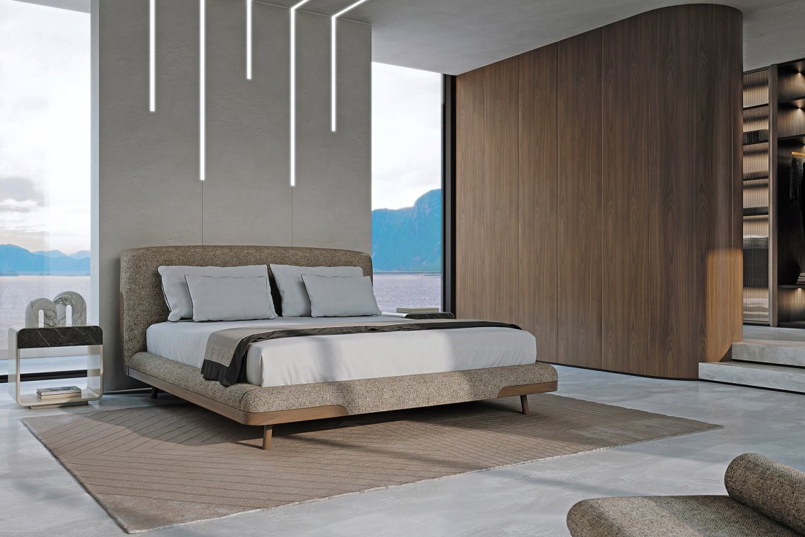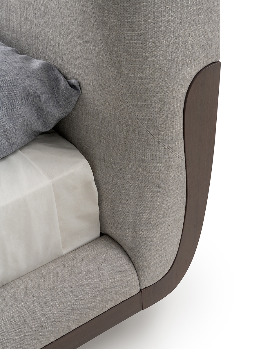The bed of the Soul collection immediately refers to a feeling of relaxation and well-being. The rounded and accommodating headboard, slightly curved around the mattress, follows the pattern of the seams, giving further softness to the shapes and wooden details that incorporate the bed frame and the headboard. Everything appears as a single and sinuous body. The bed of the Soul collection is available in different finishes as per sample card.