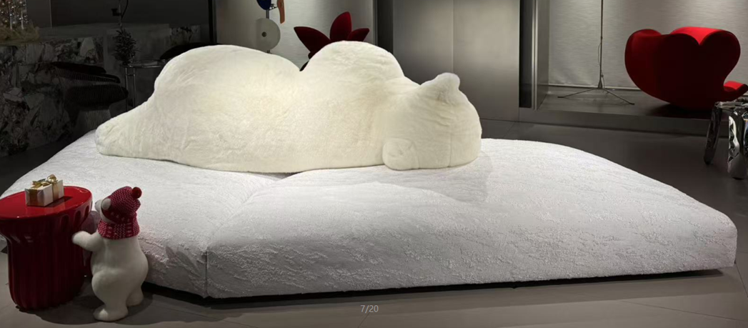 La base è imbottita di Gellyfoam? e piuma, rivestita di un tessuto esclusivo con una texture che ricorda gli strati del ghiaccio. Lo schienale è morbido, realizzato in fibra di poliestere e rivestito di pelliccia ecologica.