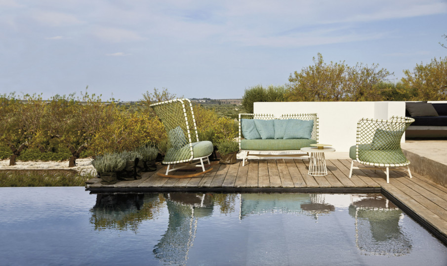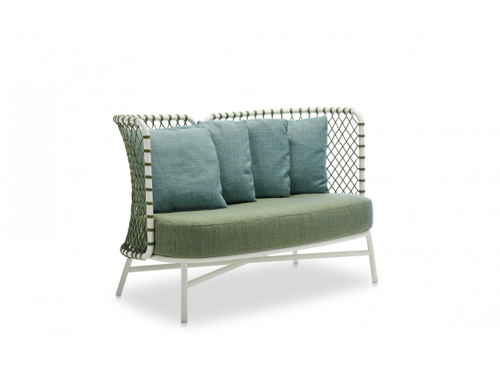 Divano in acciaio 304 verniciato a polveri, intrecciato con Flat Trendyrope. Un divano accogliente, dove la particolare geometria dello schienale si coniuga perfettamente al desiderio di comfort,  creando un angolo per vivere momenti di relax. Ottimo per arredare terrazzi e patio, dona forte personalità anche alle zone living interne. Ideale per arredamenti residenziali e contract.
