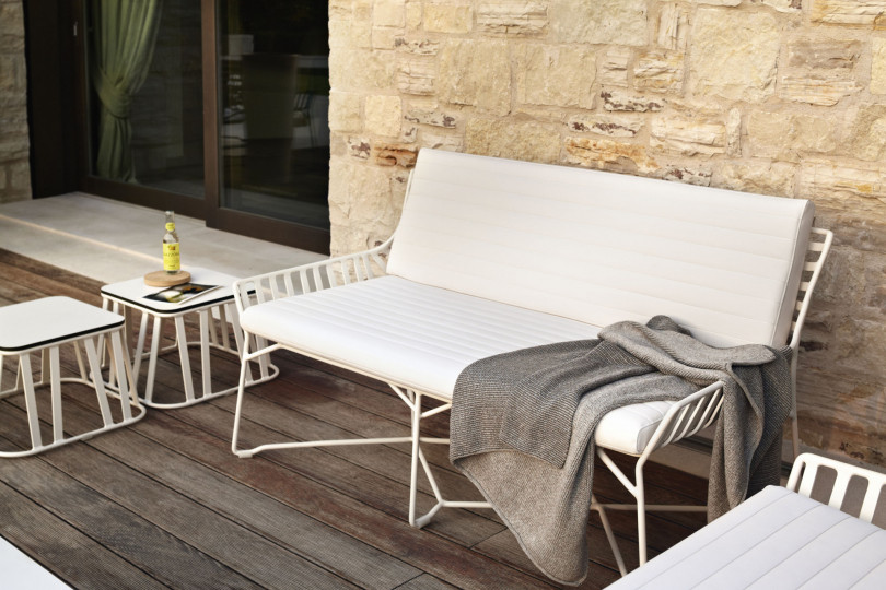 Divano in acciaio 304 verniciato a polveri, intrecciato con Flat Trendyrope. Un divano accogliente, dove la particolare geometria dello schienale si coniuga perfettamente al desiderio di comfort, creando un angolo per vivere momenti di relax. Ottimo per arredare terrazzi e patio, dona forte personalità anche alle zone living interne. Ideale per arredamenti residenziali e contract.