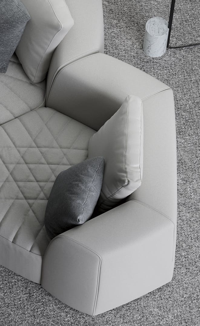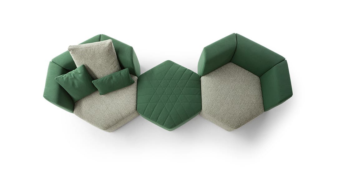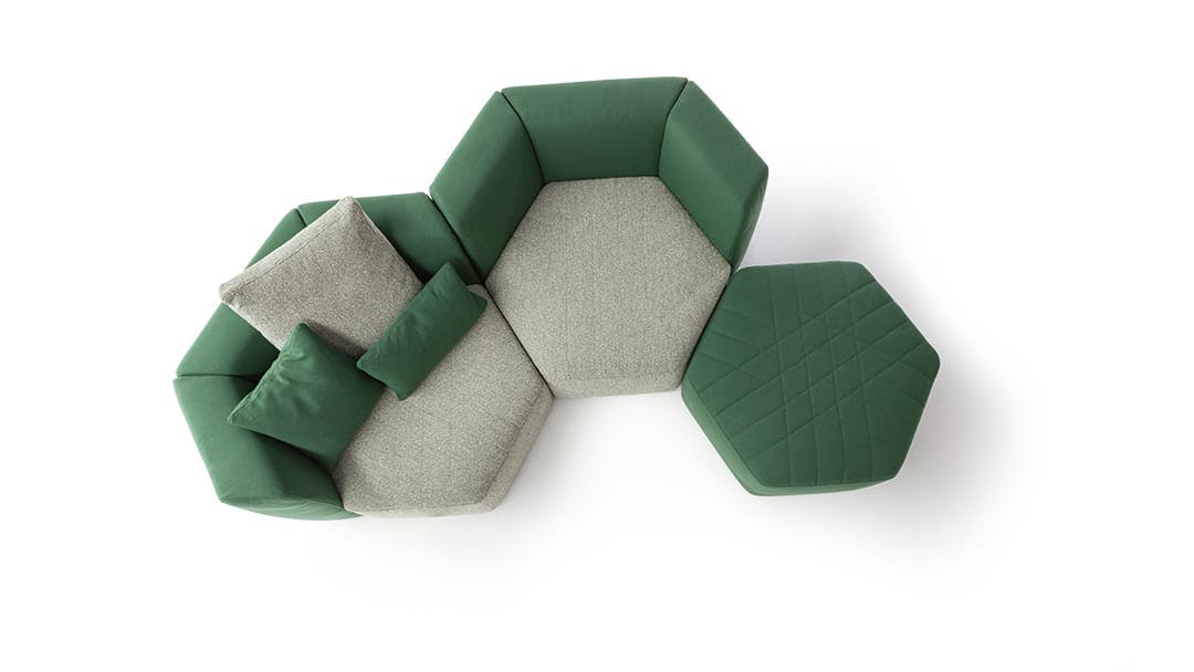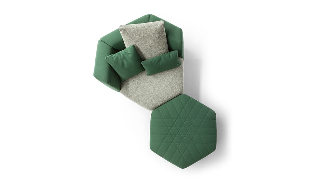 Uniting elements, bringing volumes together, creating connections: the Panorama modular design sofa is a project for the living area designed to create an absolutely new domestic landscape, to create collective spaces, islands of comfort, real protective cocoons onto which to lie back freely. Its geometry stimulates the combination of diverse elements to transform the living area into the warmest and most welcoming of environments. The Panorama collection of padded products is based on a specific item which can be considered to be the real unit of measurement of the system: the hexagonal pouf which, when fitted with armrests and a backrest, becomes an armchair which, in turn, can be combined with additional armchairs and sofas to achieve the most diverse configurations. Customisation and creativity reach their utmost expression here, and the results that can be achieved are absolutely unprecedented. The upholstery, in fabric or leather, is fully removable and is characterised by a particular quilting on the seat.