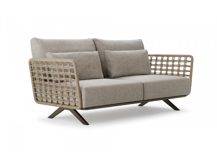 Divano 2 posti in acciaio inox Aisi 304 ed alluminio, verniciato a polveri ed intrecciato in Oval Trendyrope. Linee che valorizzano l'iconico stile italiano, dove le lavorazioni in corda donano un'estetica materica ed artigianale alla morbidezza avvolgente delle sedute, per concepire uno spazio ideale, dedicato al relax e alla socializzazione. Progettato sia per l'arredamento residenziale che contract, outdoor e indoor.