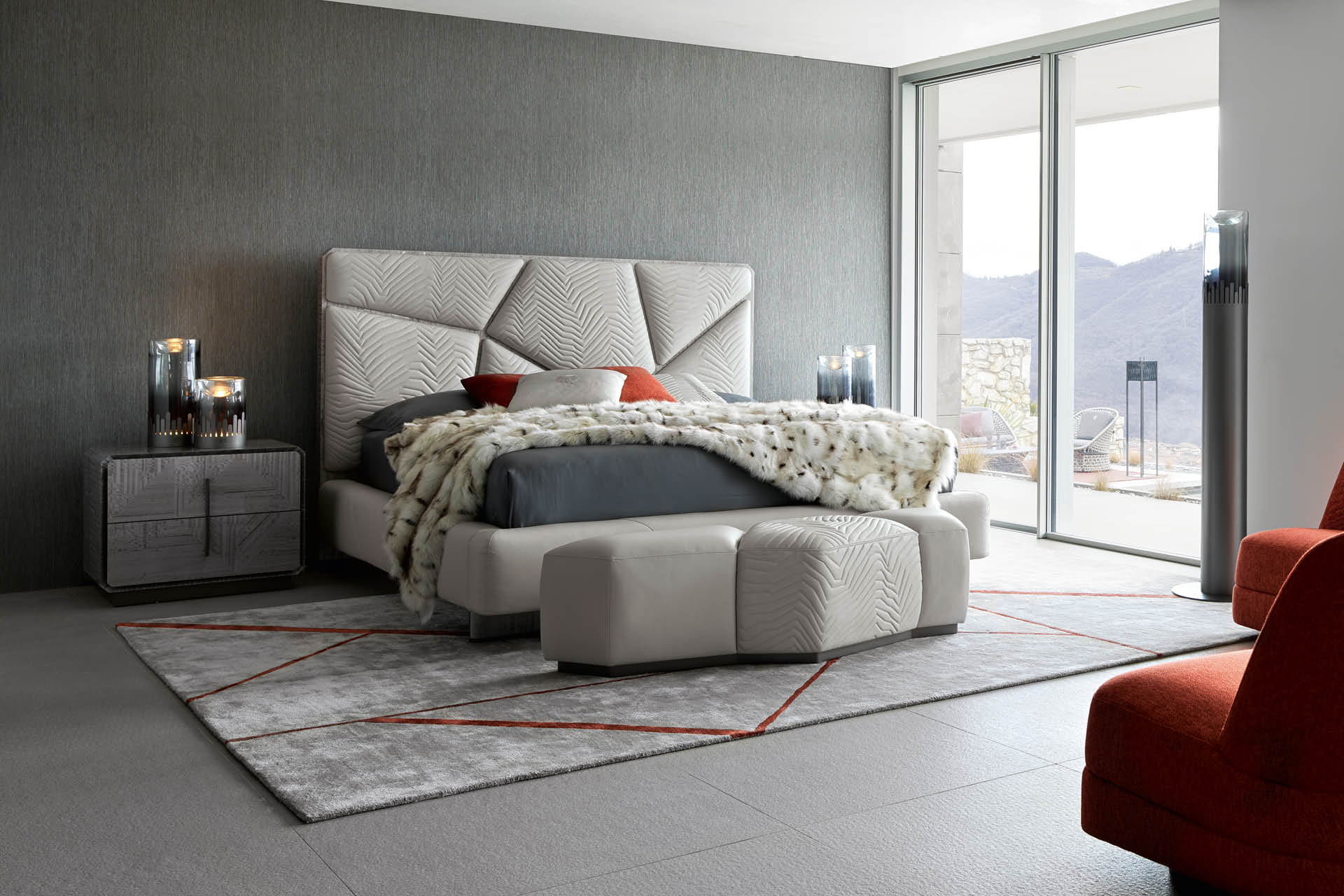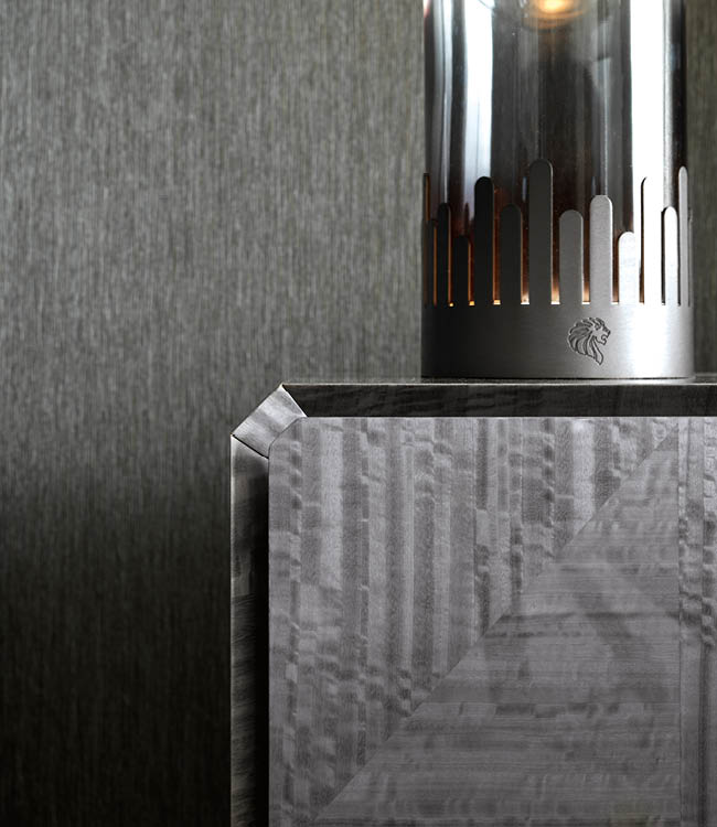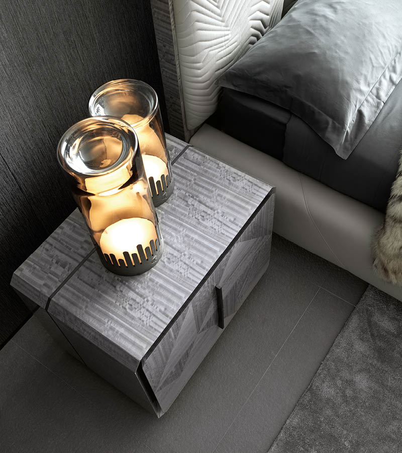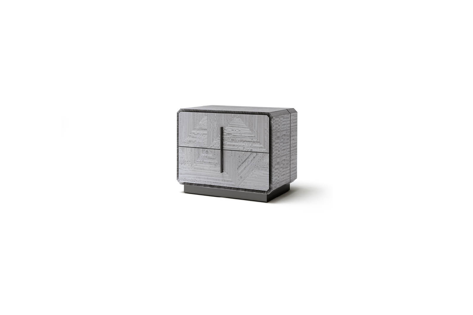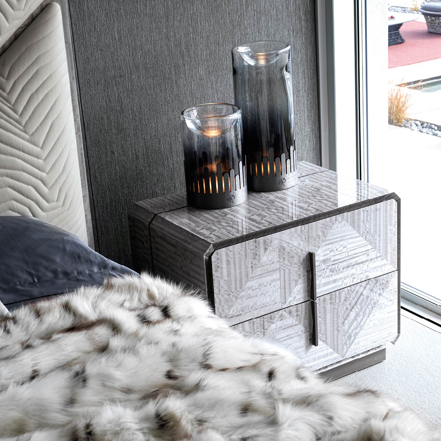 Night table in inlaid Tasmanian curly Eucaliptus veneer with high gloss polyester finish. 2 full extension drawers with bottom part in velvet fabric. Base and handles in satin grey nickel stainless steel. Top and sides with insert in satin grey nickel stainless steel.