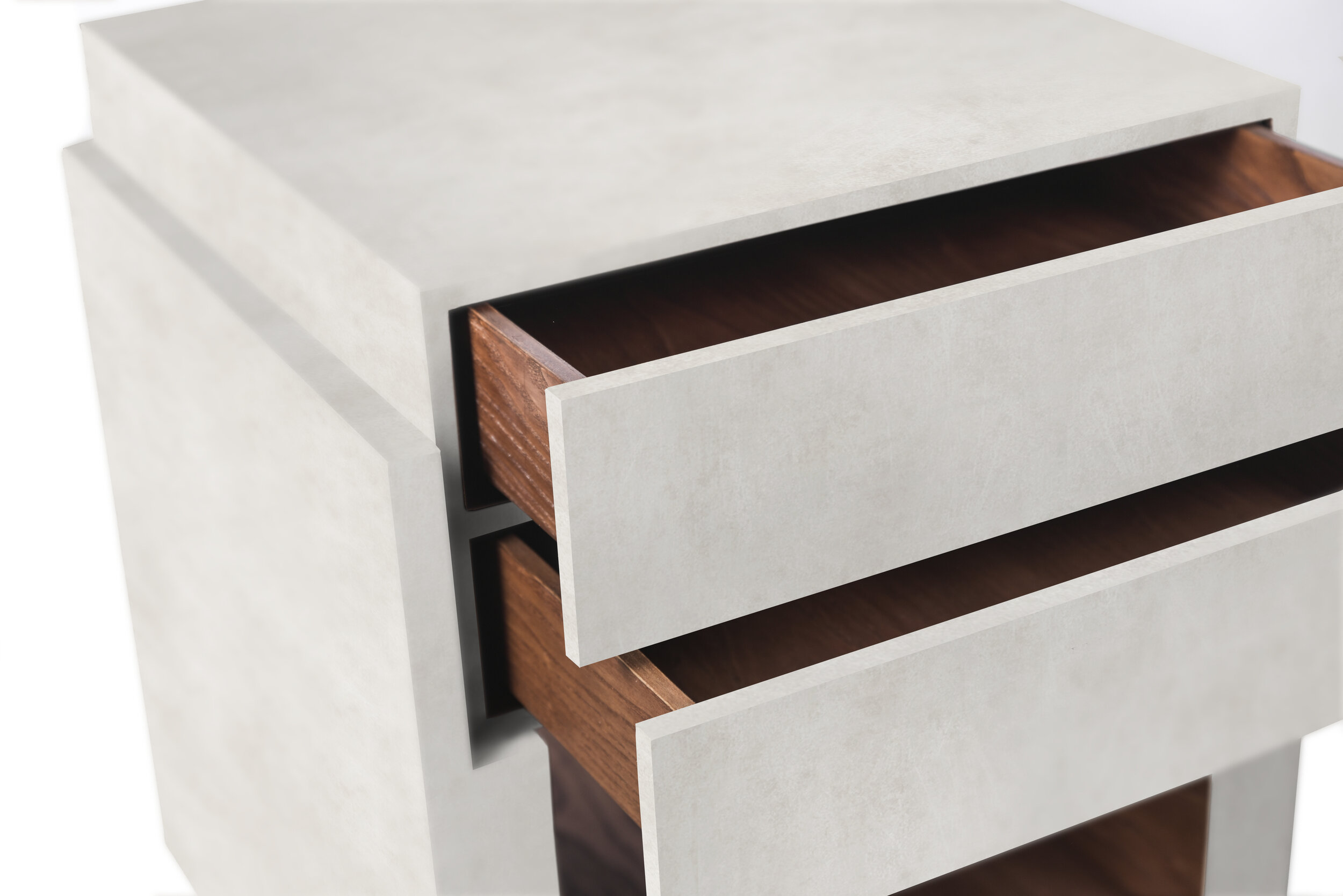 The tomboy bedside by R&Y Augousti is an elegant piece with its subtle geometry. This bedside table is completely inlaid in a mixture of cream shagreen and gemelina wood veneer in the shelf opening. This bedside table includes two drawers and a lower open shelf.