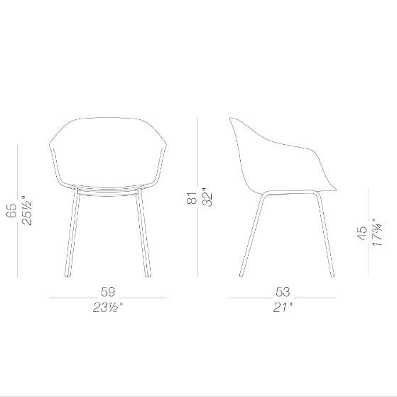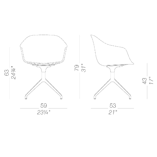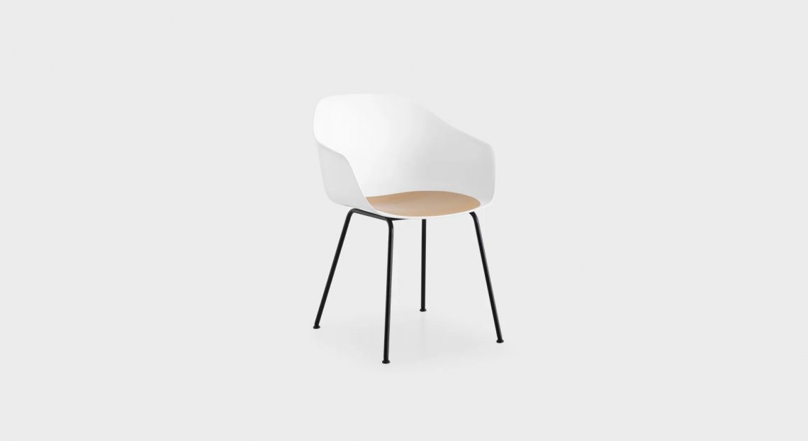 Scocca in polipropilene, con inserto integrato nella seduta rimovibile mediante 4 viti. Finiture varie con possibilità di abbinamenti tra tessuti, legno e plastiche. Disponibile anche la scocca interamente rivestita, senza inserto rimovibile.