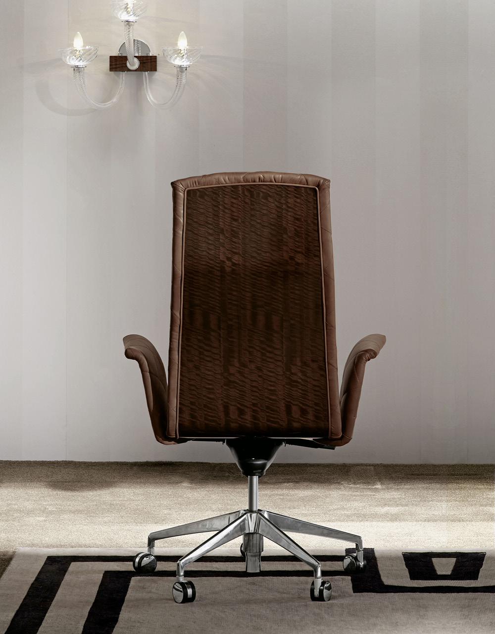 Presidential desk chair on rollers w/adjustable height, back and side panels in high gloss polyester curly eucalyptus. Avaible in first grade leather, velvet or suede fabric.