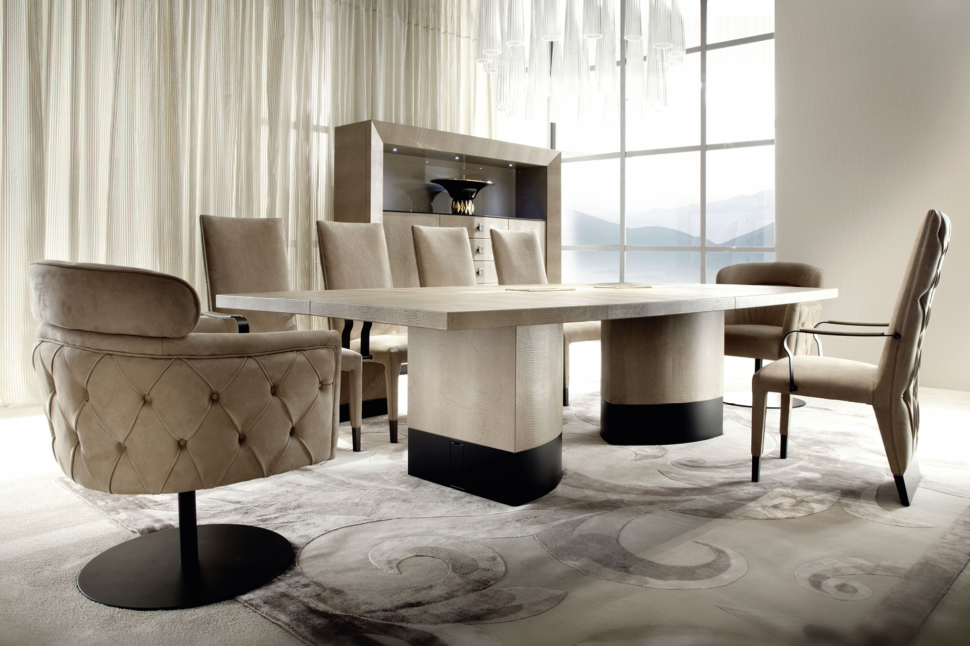 Guest office chair with buttoned back available in leather, nubuk leather, suede fabric, on wheels with adjustable height. Leather needs: mt. 4,50 Nubuk leather needs: mt. 6,00 Fabric needs: mt. 3,00