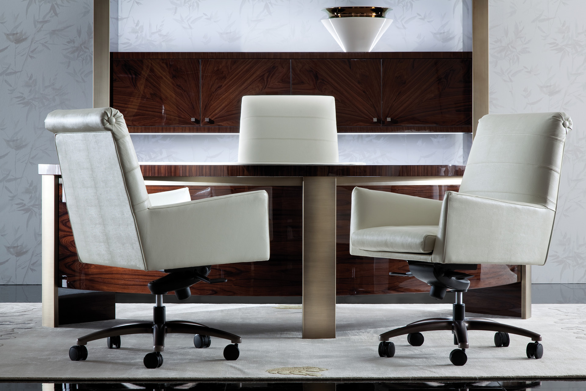 Guest office chair completely in leather, nubuk leather, velvet or suede fabric, on wheels with adjustable height. Base in bronzed stainless steel. Leather needs: mt. 4,50 Nubuk leather needs: mt. 6,00 Fabric needs: mt. 3,00